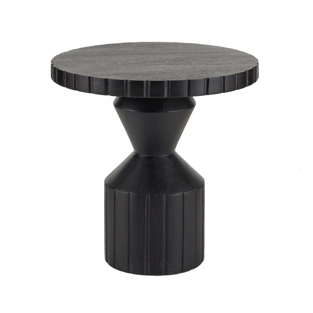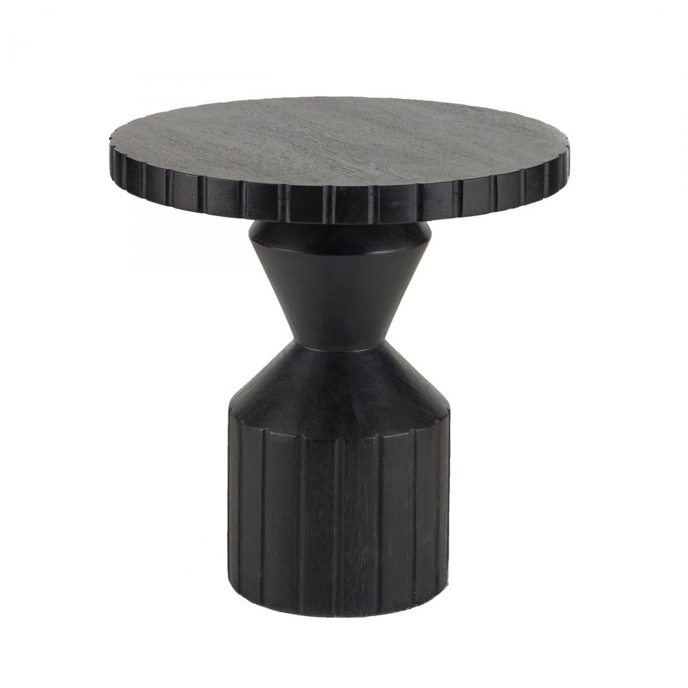 Accented with gear-like etching at the base and top, our machined end table possesses an industrial edge. Carved of ebony mango wood, the bold faceted shape highlights its totemic architecture. Finish will vary.