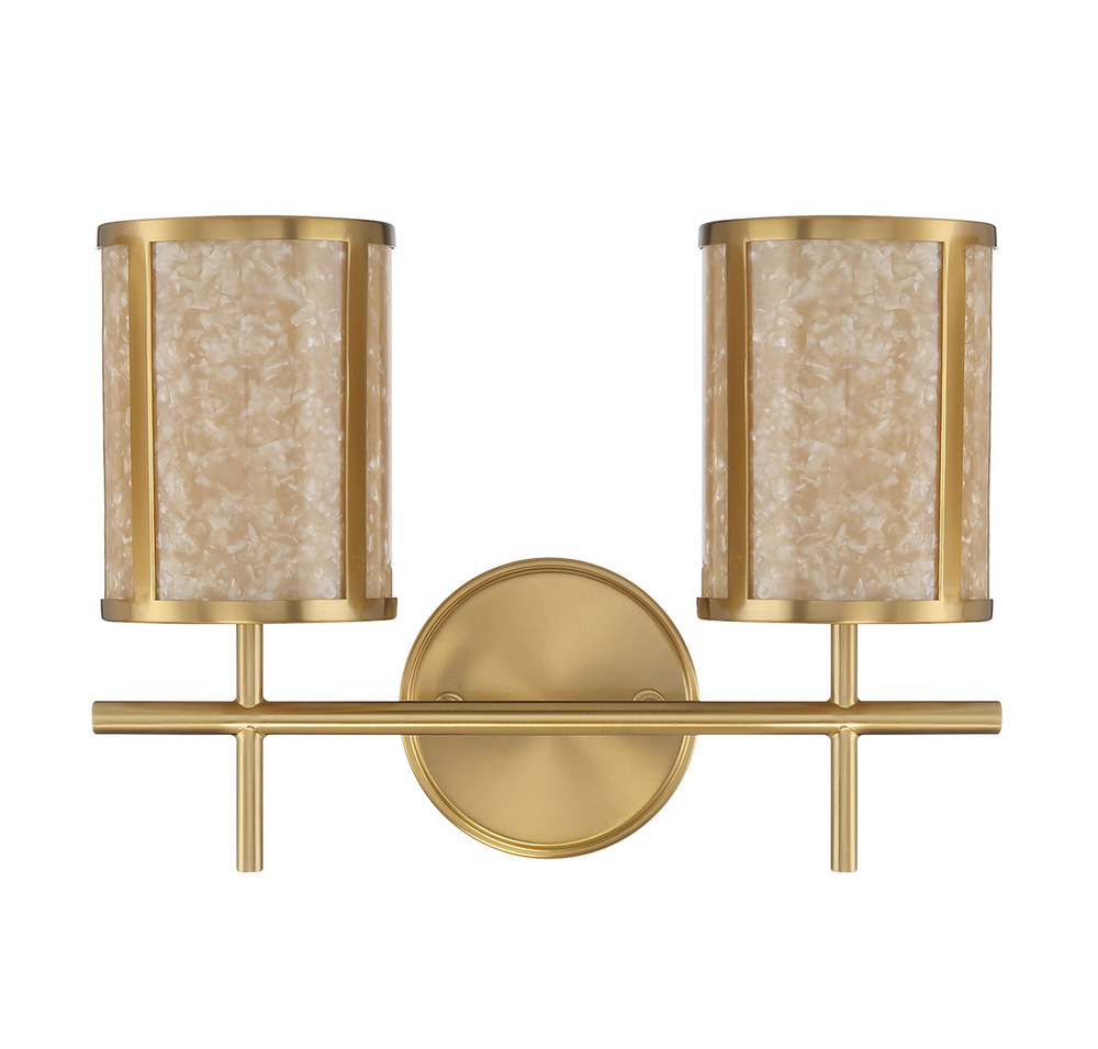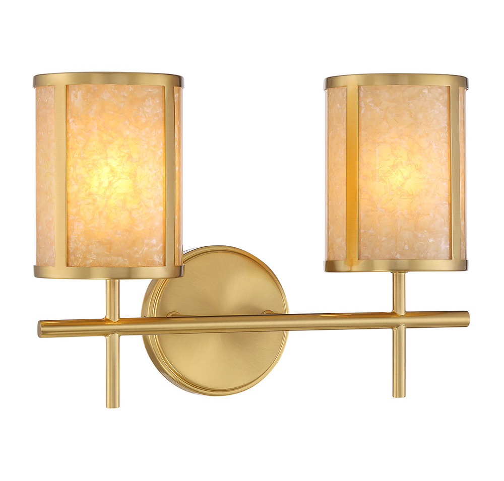 This brilliantly beautiful Savoy House Camden 2-light bath light brings a nature-inspired glow to your vanity. The light shines from within shades adorned with shell accents, their swirling patterns creating another layer of wonder while the Warm Brass finish adds richness. Camden is 10.25" in height, 14.75" in width and extends 7" from the wall. Uses two candelabra size bulbs of up to 60 watts per bulb. Bulbs not included. This bath light is damp area rated and may be installed with the glass facing up or down.