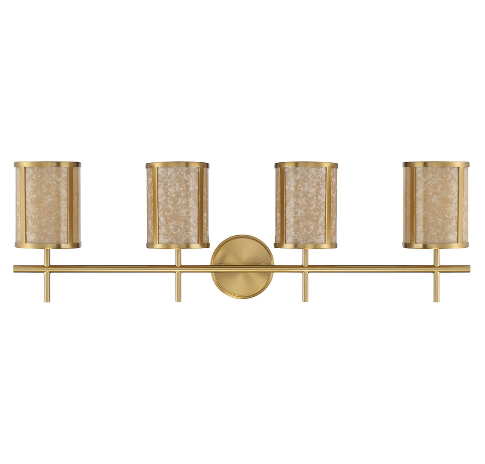 This brilliantly beautiful Savoy House Camden 4-light bath light brings a nature-inspired glow to your vanity. The light shines from within shades adorned with shell accents, their swirling patterns creating another layer of wonder while the Warm Brass finish adds richness. Camden is 10.25" in height, 33.75" in width and extends 7" from the wall. Uses four candelabra size bulbs of up to 60 watts per bulb. Bulbs not included. This bath light is damp area rated and may be installed with the glass facing up or down.