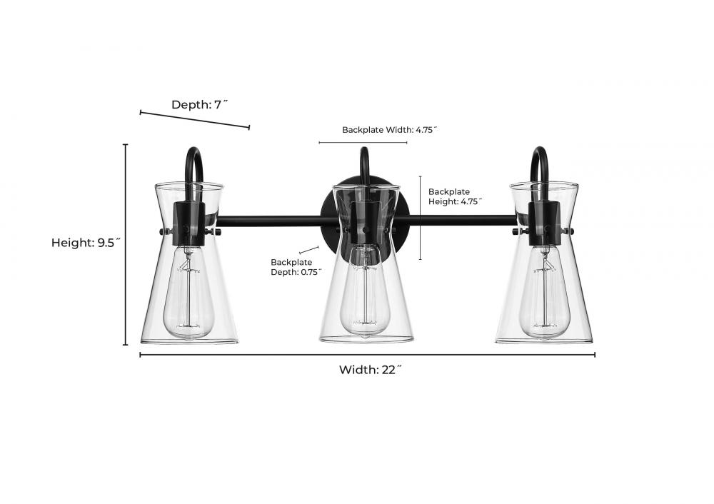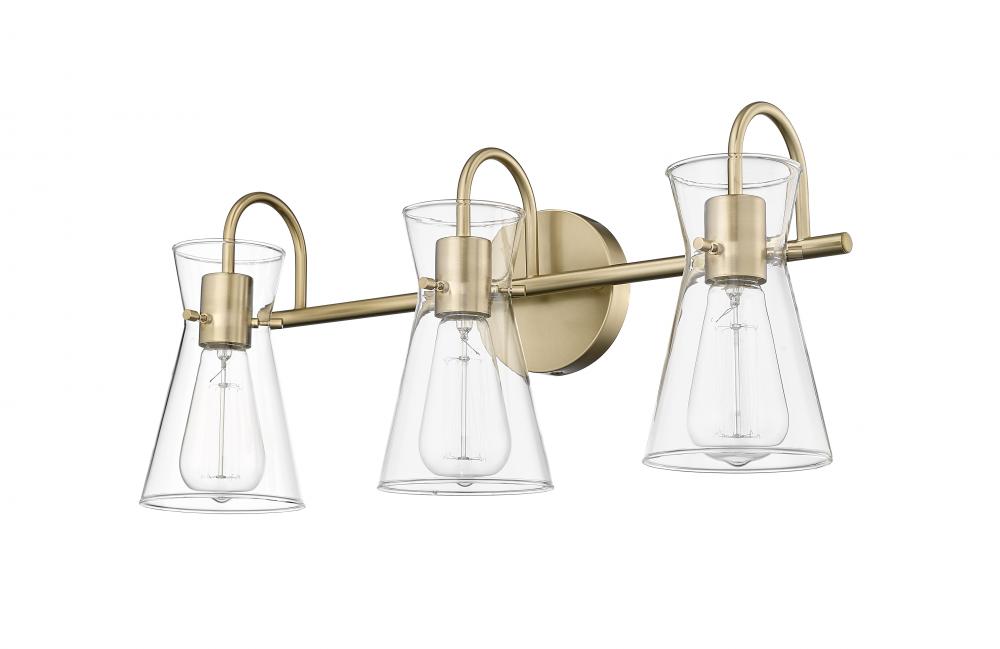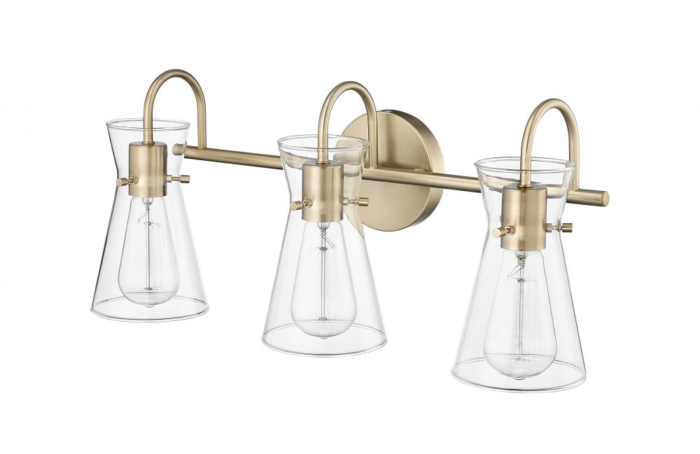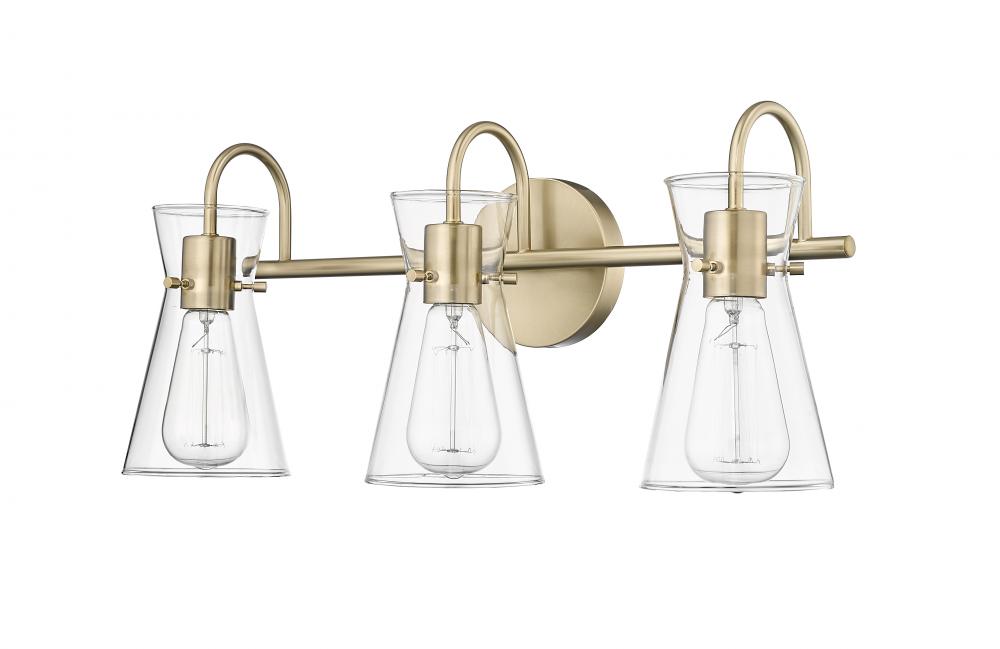 Distinctive beaker-shaped clear glass globes define the look of the Camellia Collection of vanity lighting. The overall design ensures well-defined lighting without shadows in the most needed spaces. The fixtures, featuring swan-neck lines and finished in modern gold, brushed nickel, or matte black, complete the overall design-forward effect and are available in 2-light, 3-light, and 4-light options.