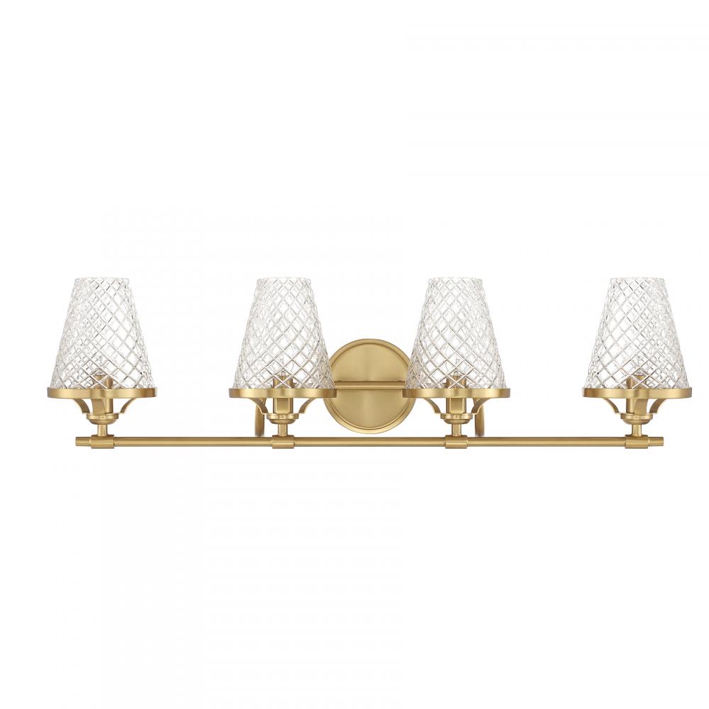 Infuse a bathroom with the vintage-inspired charm of the Candler 4-light bath bar from Savoy House. Four shades of tapered clear glass showcase a diamond pattern that adds texture, heightens the drama and recalls beautiful antique glassware. Warm Brass finish. Candler is 8.75" in height, 32" in width and extends 7.5" from the wall. Uses four candelabra size bulbs of up to 60 watts per bulb. Bulbs are not included. This bath light is damp area rated and must be installed as shown.