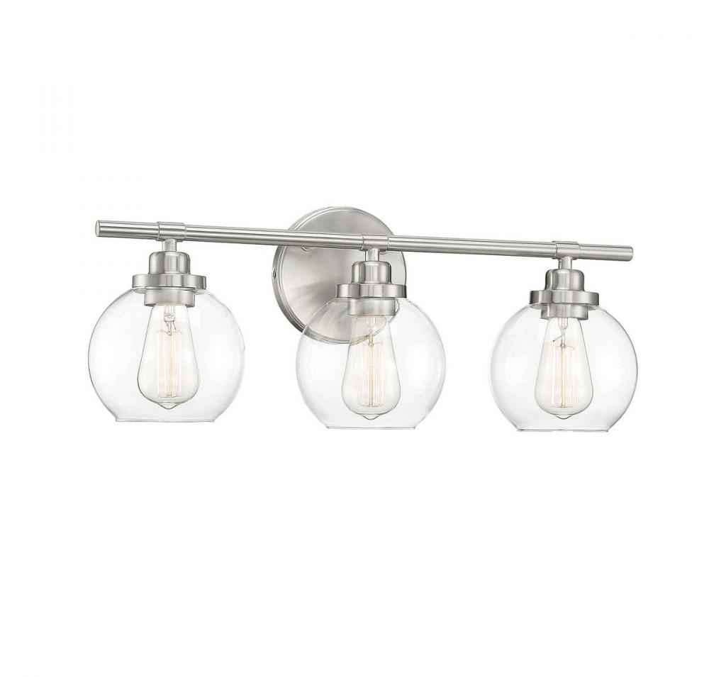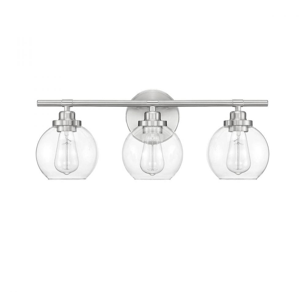Adding the Savoy House Carson 3-light bath bar easily helps you boost the illumination and the style of any bathroom. Its fishbowl-style clear glass shades make a big statement and are open at the bottom, making it easy to replace the bulbs. The streamlined structure offers up subtle detailing with a mid-century modern vibe and the circular backplate echoes the shape of the glass shades. Finished in satin nickel. This fixture is 22.5" wide and 8.5" tall. It extends 7" from the wall. Uses 3 standard size bulbs of up to 60 watts each (not included).