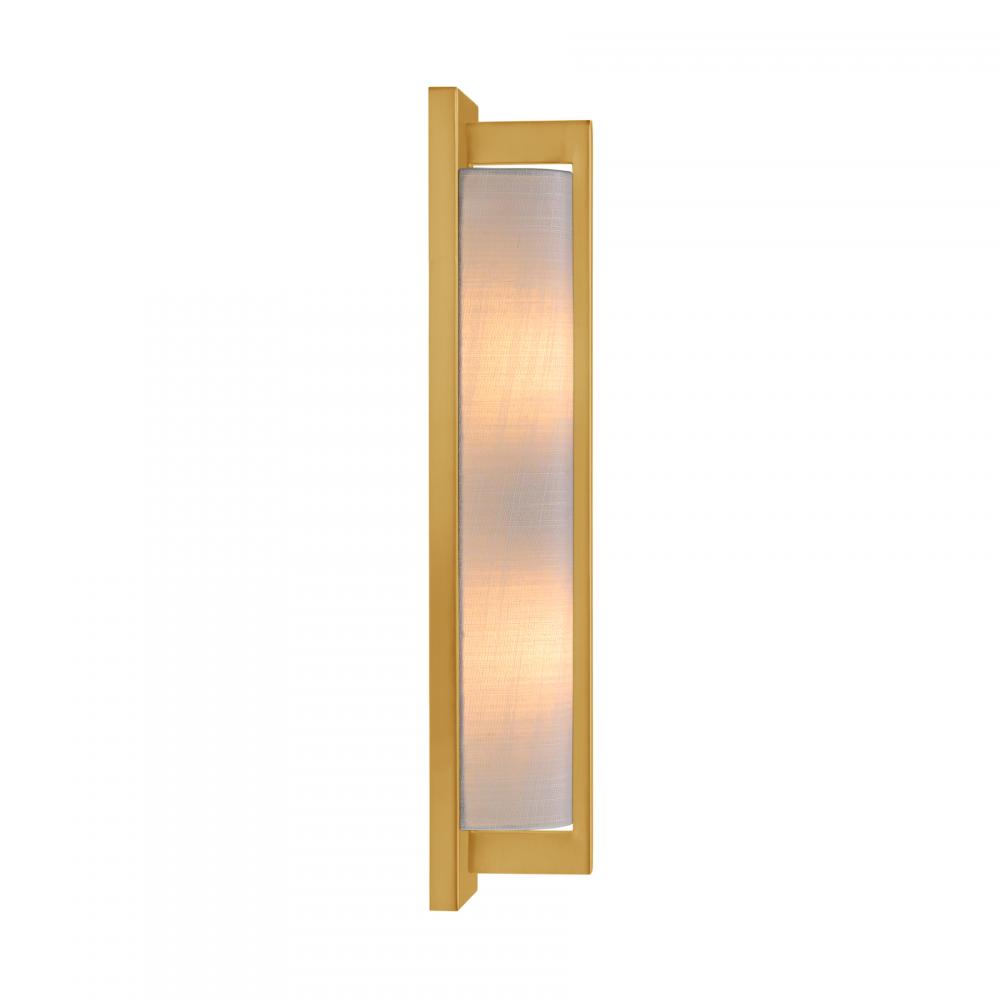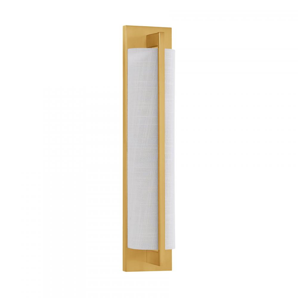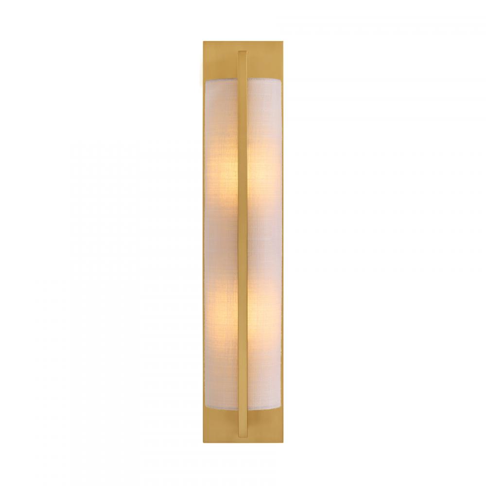The Savoy House Carver 2-light sconce is oh so sleek and oh so chic. A long, tall white fabric shade is held to the backplate by an arm that overlaps the shade to create a sense of symmetry and is decorated with a Warm Brass finish. Carver is 22" in height, 4.5" in width and extends 4" from the wall. Uses two candelabra size bulbs of up to 40 watts per bulb. Bulbs not included.
