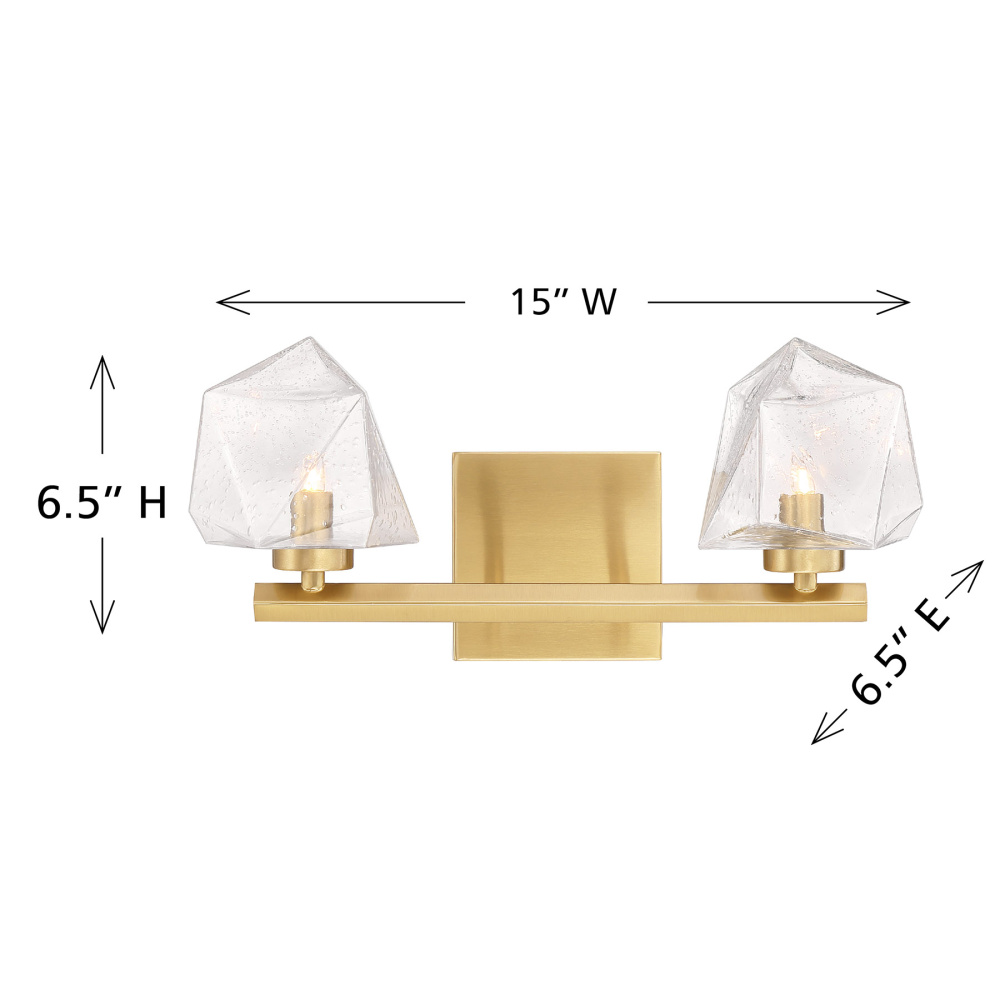 The Castello 2-light bath light from Savoy House is cool as ice! Its sharply cut shades of clear hammered glass add a bright touch of geometry and texture, pairing perfectly with the thick arm and backplate that is finished in Warm Brass. Castello is 6.5" in height, 15" in width and extends 6.5" from the wall. Uses two LED G9 bulbs. Bulbs not included.