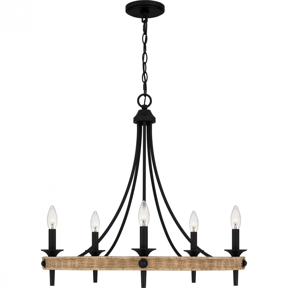 Part of the Quoizel Naturals collection, the Catania chandelier features natural elements and materials. The classic silhouette is accentuated by a matte black finish, slender candle sleeves and matching bobeches. A round ring made of rattan surrounds the