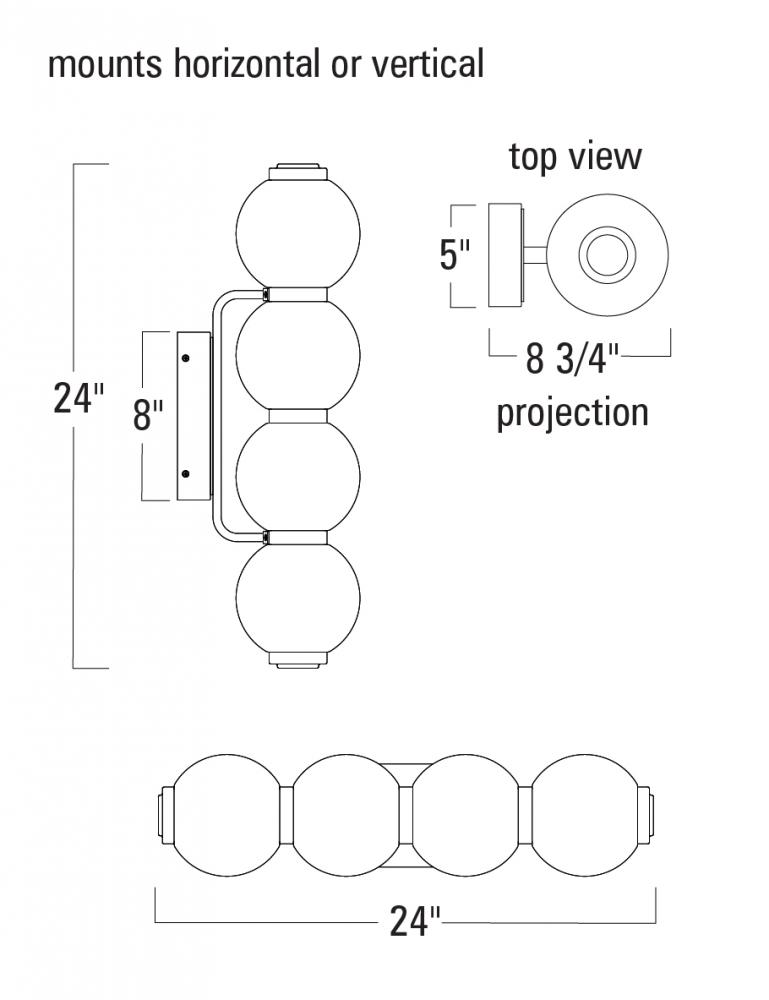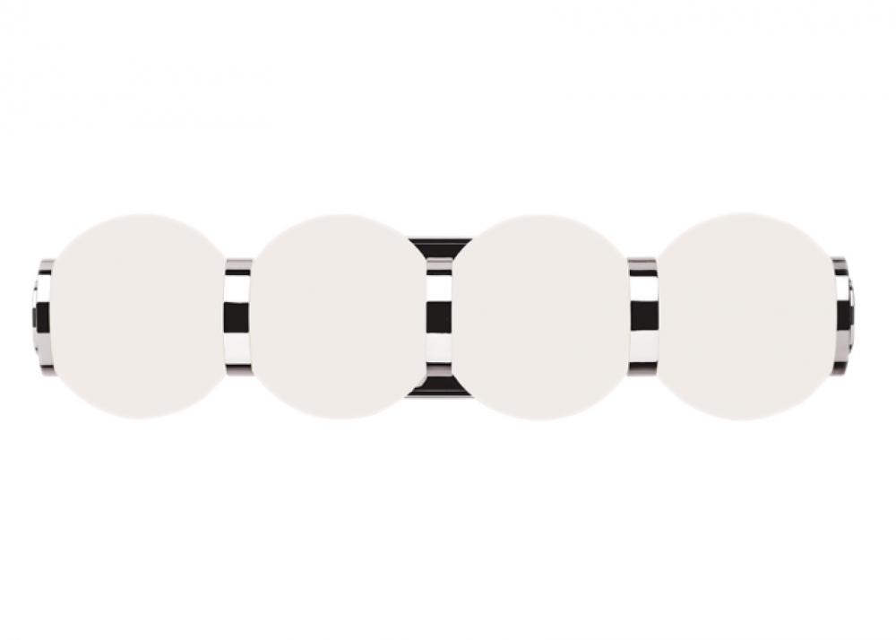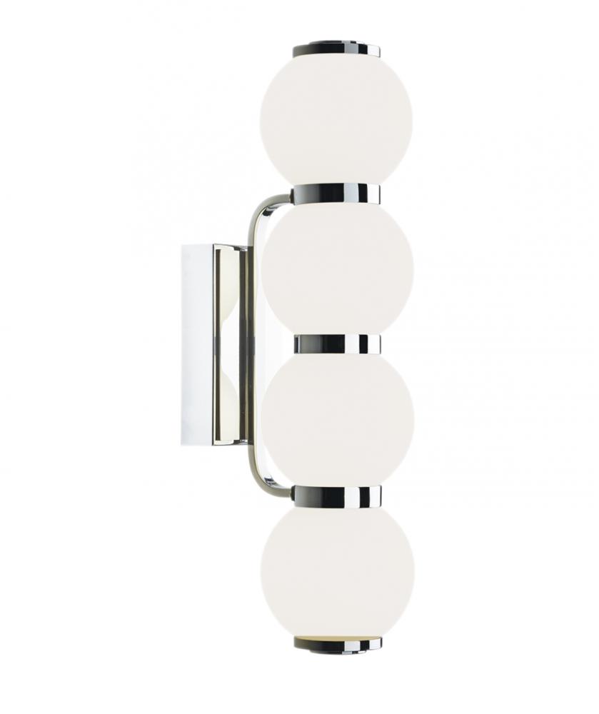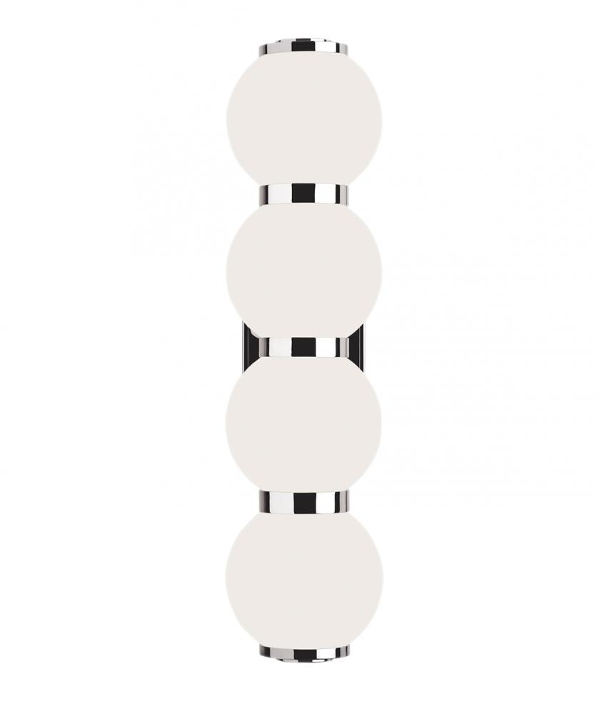 Contrasting rings articulate a string of opaque white glass globes for a bejeweled effect. The matching backplate supports the integrated LED fixture even as it seems to float in midair. Available in 24 inches, with Matte Black or Chrome details.