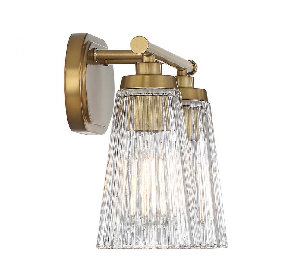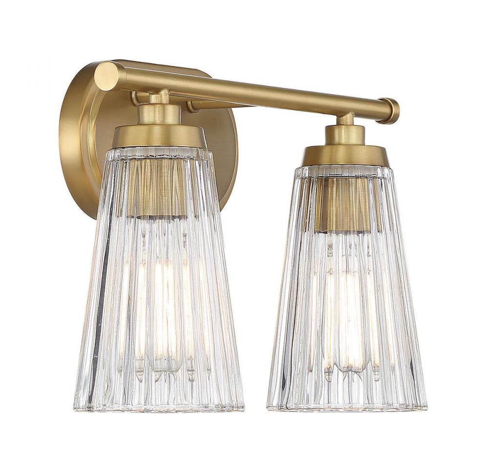Textured, eye-catching shades of clear ribbed glass take center stage in the Chantilly 2-light bathroom vanity light from Savoy House. Finished in warm brass. Chantilly is 10" in height, 14" in width and extends 7" from the wall. Uses two standard size bulbs of up to 60 watts per bulb. Damp area rated.
