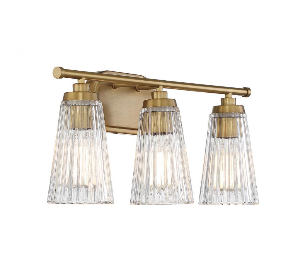 Textured, eye-catching shades of clear ribbed glass take center stage in the Chantilly 3-light bathroom vanity light from Savoy House. Finished in warm brass. Chantilly is 10" in height and 22" in width. It extends 7" from the wall. Uses three standard size bulbs of up to 60 watts per bulb. Damp area rated.
