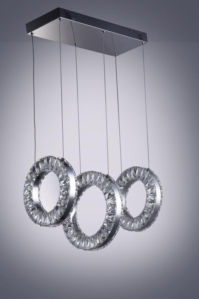 Rings of Beveled Crystals are mounted into a Polished Chrome band and suspended from cable as if they were floating in air. Multiple size rings mounted in descending order create a unique and brilliant light form which is sure to be the focal point of the