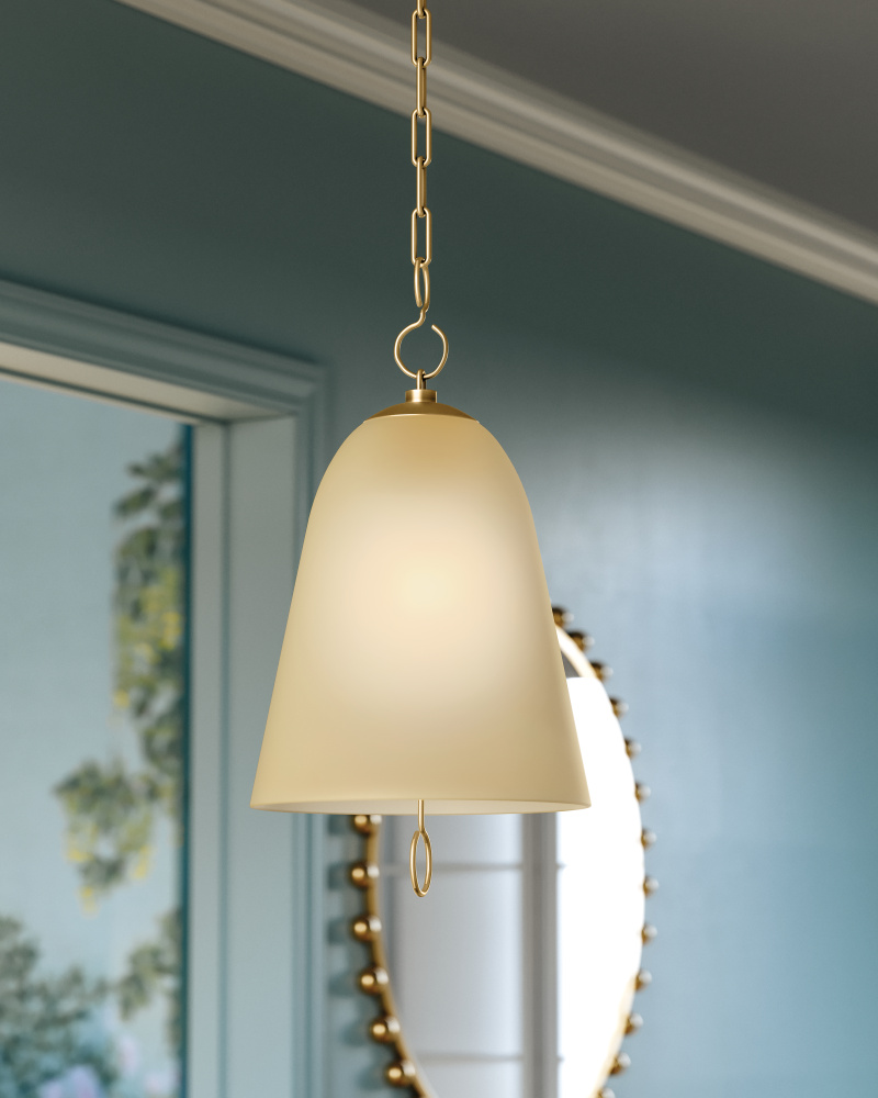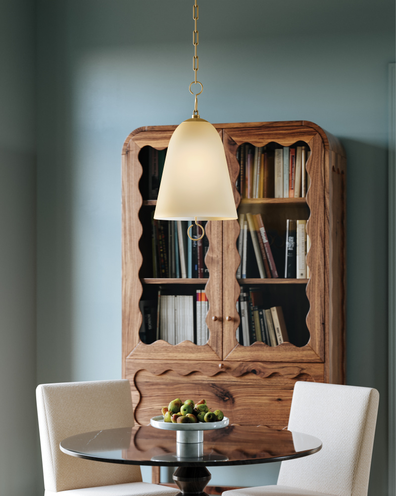 Like modern jewelry for a room, the Christine family pairs subtle, yet special glass treatments with unusual looped chain details. The warmth of the champagne glass works in tandem with the curved shaping of the shade to create a gentle diffusion of light. Welded ring details shine above and below the glass, adding a decorative detail to the earring-like silhouette. Available as a pendant in two sizes and a wall sconce, Christine can be used solo or in multiples to create a welcoming mood.