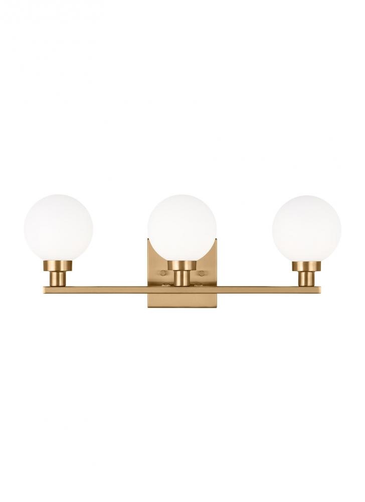 The Clybourn three light vanity fixture in Satin Brass is an industrial yet minimalist design, making this fixture perfect for an eclectic living room or over a modern dining room table. Milk Glass gives the Clybourn series a more current look.