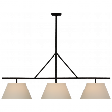 The Collette by Suzanne Kasler brings a relaxed elegance to any table or kitchen island. Its sleek metal frame, available in polished nickel, aged, or gilded iron, supports three linen shades, providing warm and inviting light.