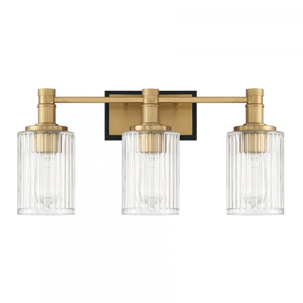 Add a big dose of shimmer with the Concord 3-light bath vanity light from Savoy House. Its ribbed glass shades are paired with ribbed detailing on the arms, boosting the inviting texture. The Matte Black and Warm Brass finish helps every element shine. Concord is 10.5" in height, 22" in width and extends 6.5" from the wall. Uses three standard size bulbs of up to 60 watts per bulb. Bulbs not included. Damp area rated. Must be installed as shown.