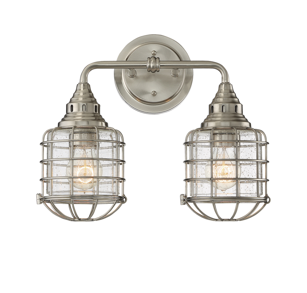 Looking for unique bath lighting to complement industrial, transitional, contemporary or urban farmhouse d?cor? The Connell 2-light bath bar, artfully designed by Brian Thomas and made with pride by Savoy House, is a great option. Like other designs in the Connell family of interior lighting products, this bath light fixture features a satin nickel finish and metal cages surrounding clear seeded glass shades, each housing a bulb. While it?s perfect when used as a vanity light in the bathroom with the Connell satin nickel semi-flush as your ceiling light, it doesn?t have to be reserved for bath lighting only. This fetching wall light looks equally intriguing as entry lighting, or in the bedroom, office, hallway or media room.