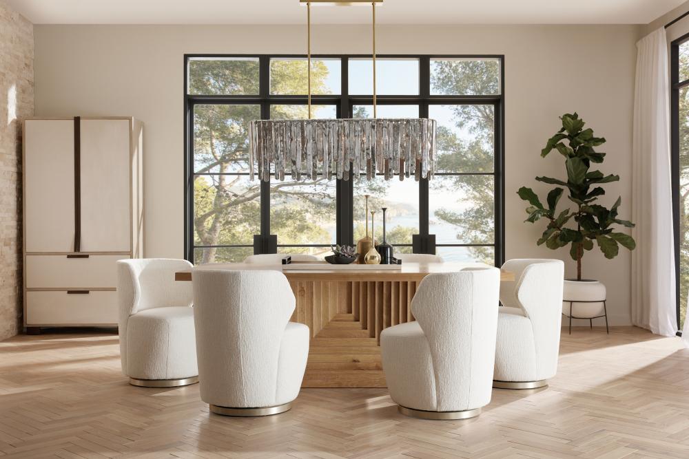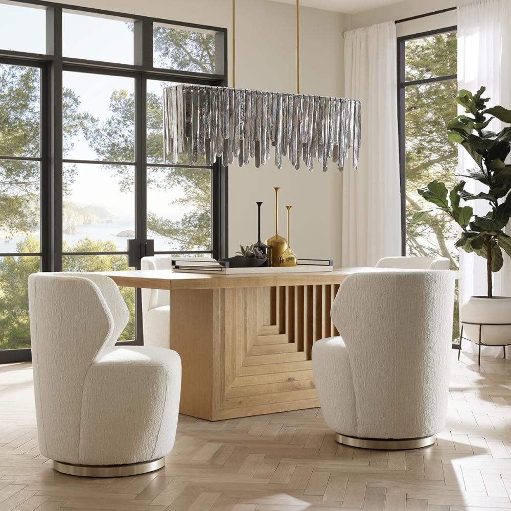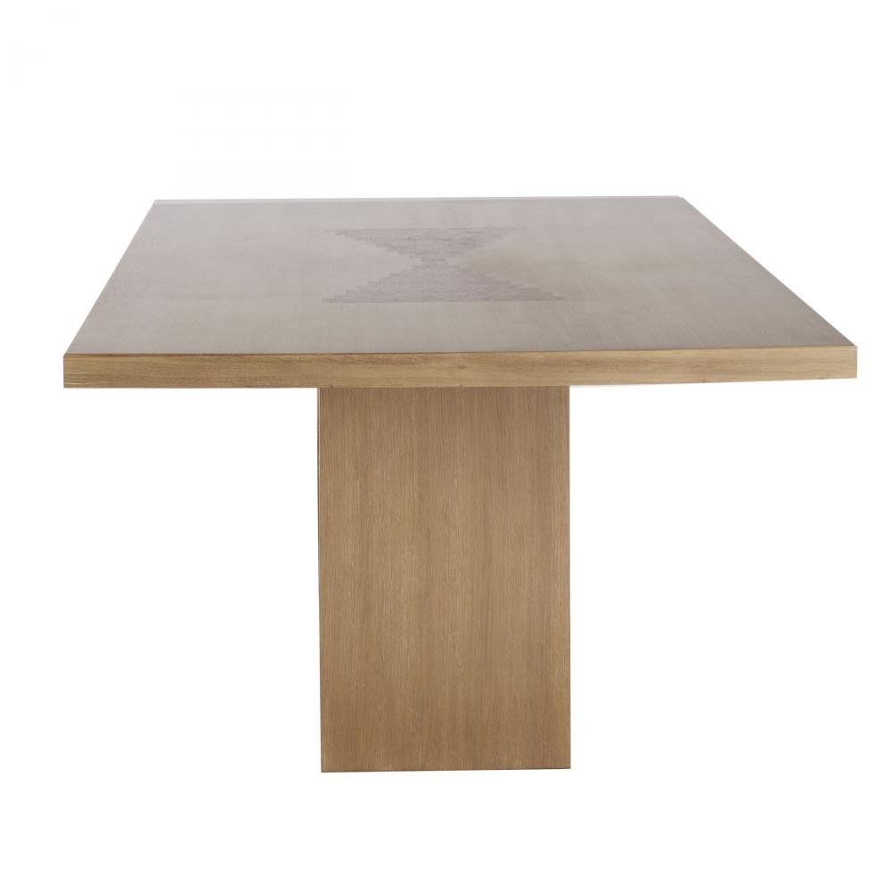We over scaled the dimensions of a rectangular pedestal table to make it a monumental centerpiece. A stepped, reversed pyramid base offers a ceremonial quality, while the oyster-finished oak veneer top is luxuriously detailed with intriguing, mirrored insets of dark oyster oak veneer. Finish will vary.