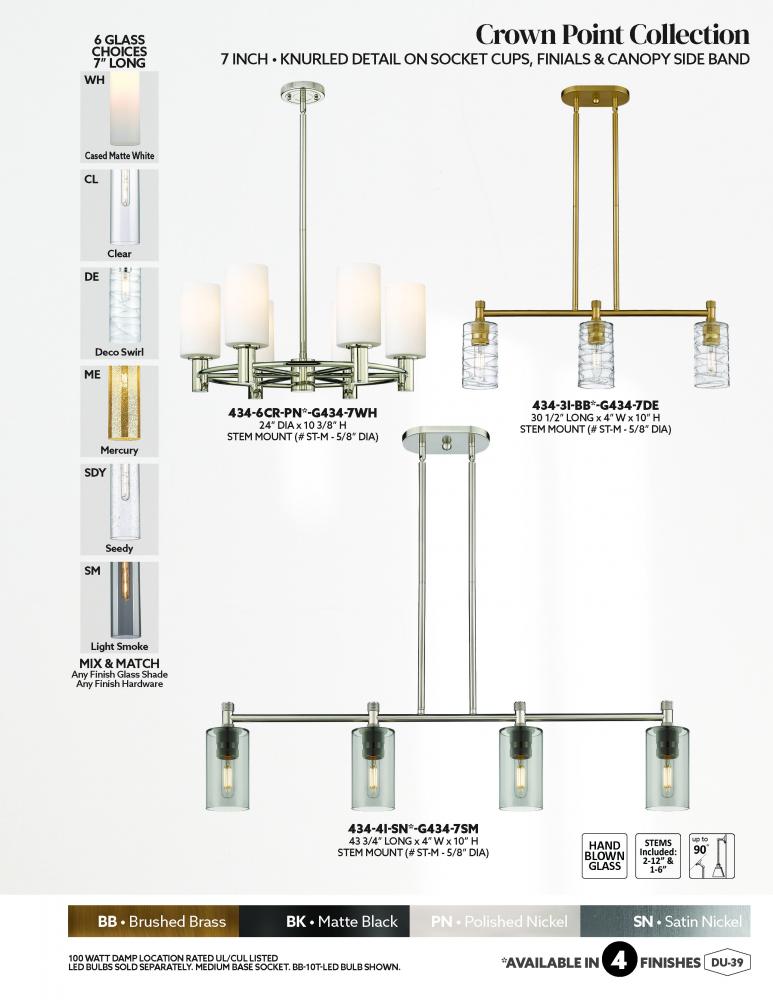 Details abound in the Crown Point Collection with an industrial take on modern sophistication. This stunning line of fixtures features cylindrical glass set in an updated restoration style frame with intricate knurling detail on the sockets, canopy, and fi