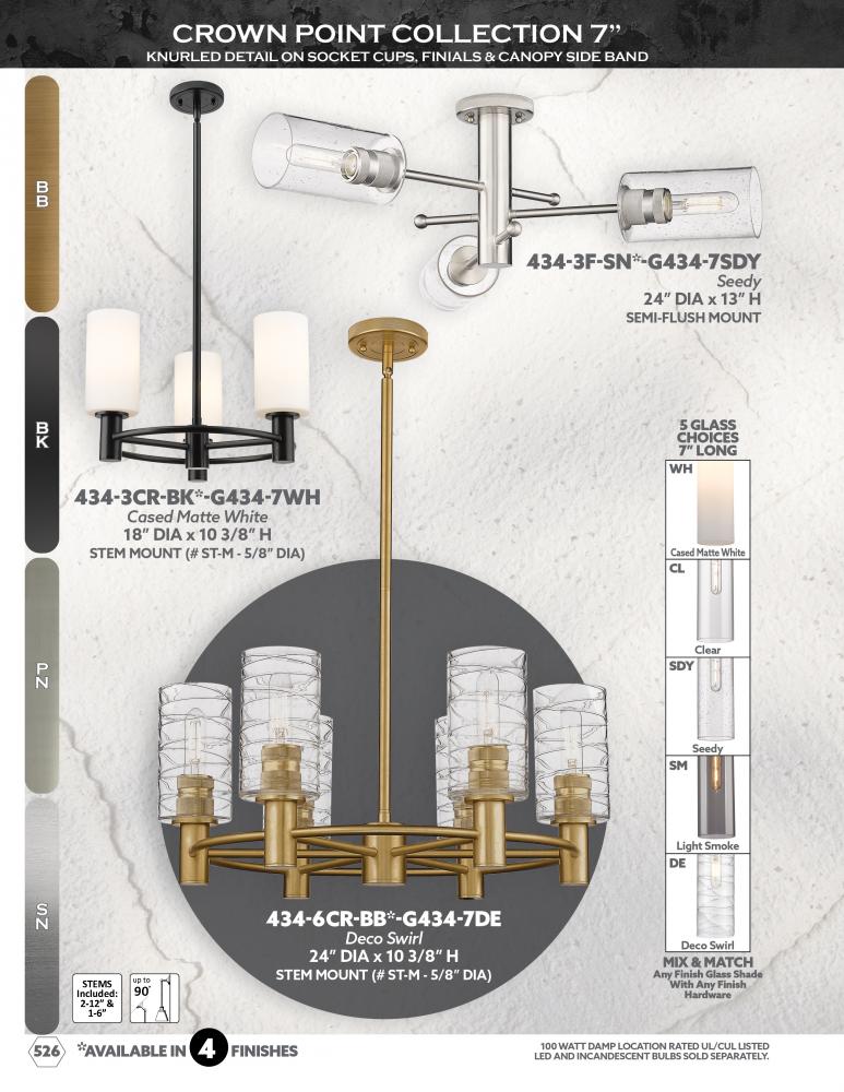 Details abound in the Crown Point Collection with an industrial take on modern sophistication. This stunning line of fixtures features cylindrical glass set in an updated restoration style frame with intricate knurling detail on the sockets, canopy, and fi