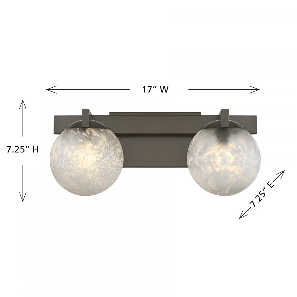 The Savoy House Darien is a 2-light bath bar with fabulously chilly appeal. A minimal frame is finished in bold Mediterranean Bronze and holds two orbs of Ice Glass, adding sub-zero cool with tons of frosty texture. Darien is 7.25" in height, 17" in width and extends 7.25" from the wall. Uses two candelabra size bulbs of up to 60 watts per bulb. Bulbs not included. This bath bar is damp area rated.