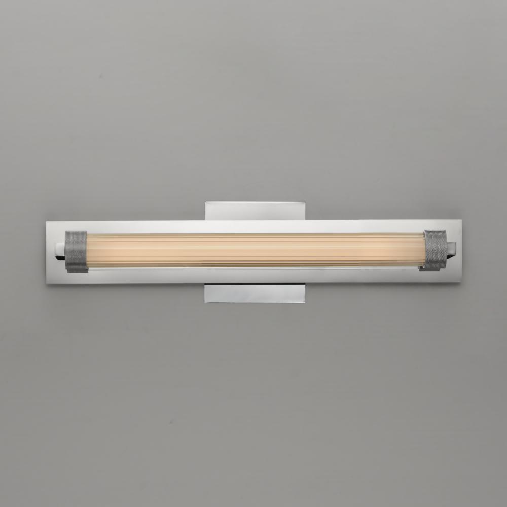 Clear ribbed glass encases a tube of opal white acrylic evenly illuminated by LED. The ends of the glass shade are fitted with knurled cylinder forms that suspend the sconces from their mounting plates. Dual mounted options are available for this series al