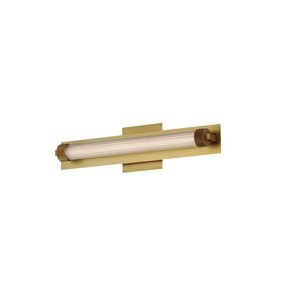 Clear ribbed glass encases a tube of opal white acrylic evenly illuminated by LED. The ends of the glass shade are fitted with knurled cylinder forms that suspend the sconces from their mounting plates. Dual mounted options are available for this series al