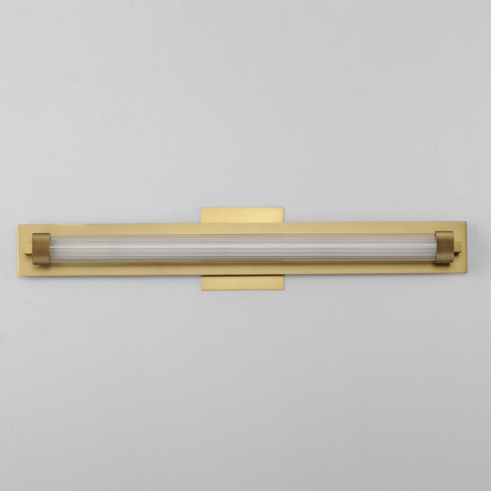 Clear ribbed glass encases a tube of opal white acrylic evenly illuminated by LED. The ends of the glass shade are fitted with knurled cylinder forms that suspend the sconces from their mounting plates. Dual mounted options are available for this series al