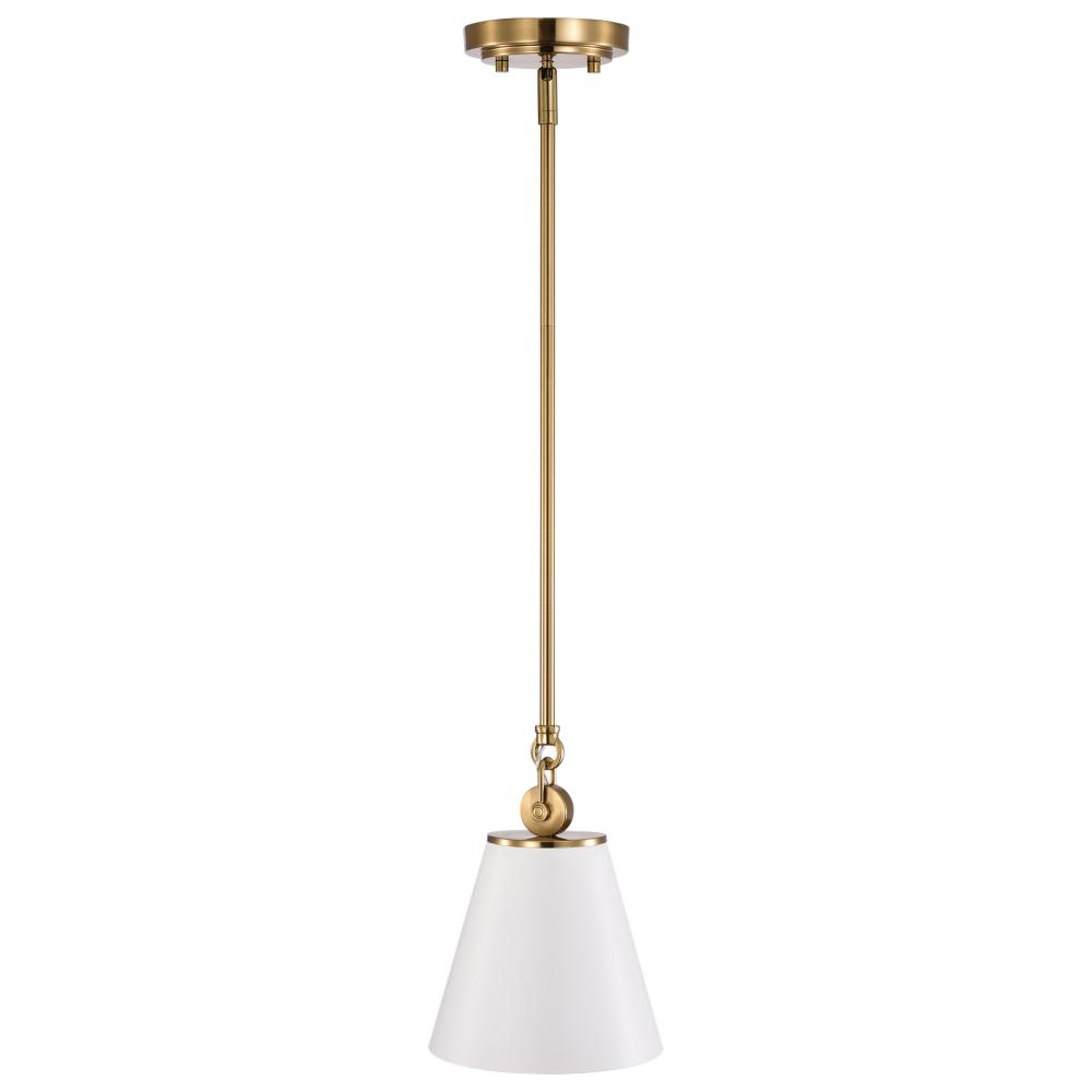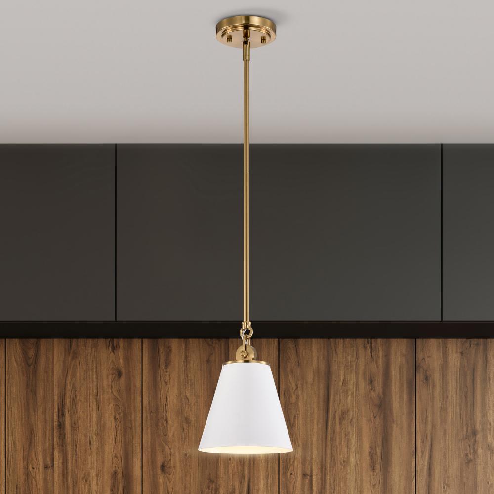 With subtle detailing, the Dover 60-7409 pendant is graceful yet unassuming. The simple white shade features a white lining to reflect the light, and the trim is finished in vintage brass to match the fixture's body. Place a trio of them over a kitchen