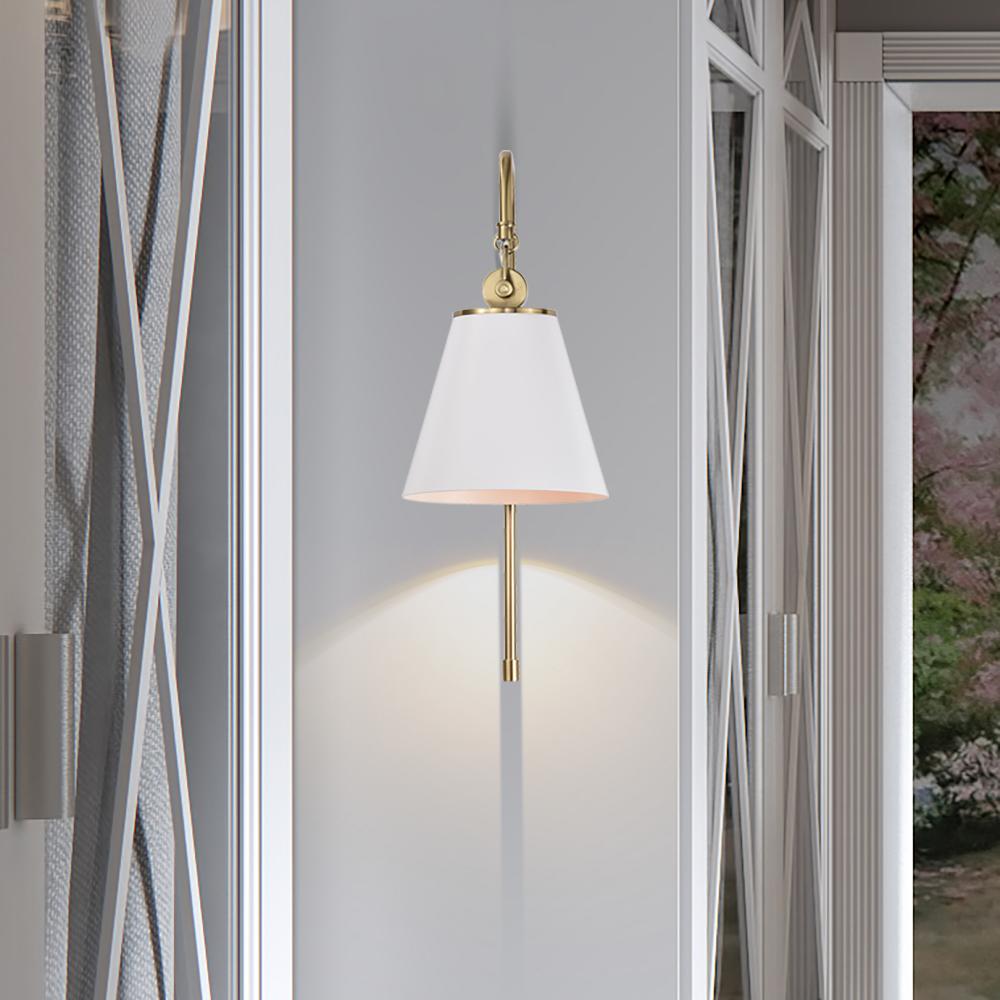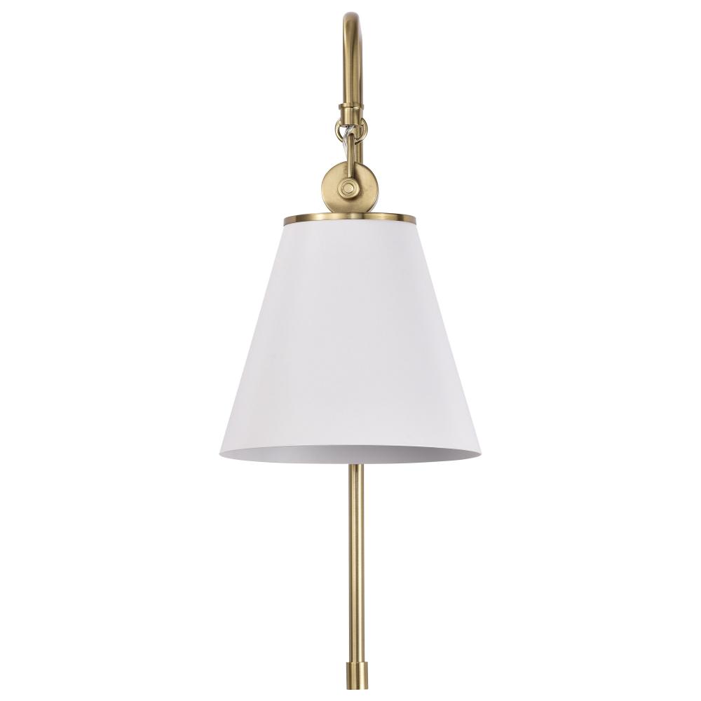 With subtle detailing, the Dover wall sconce is graceful yet unassuming. The simple white shade features a white lining to reflect the light, and the trim is finished in vintage brass to match the fixture's body. Place in a dining room for ambiance, or