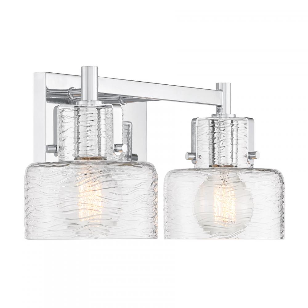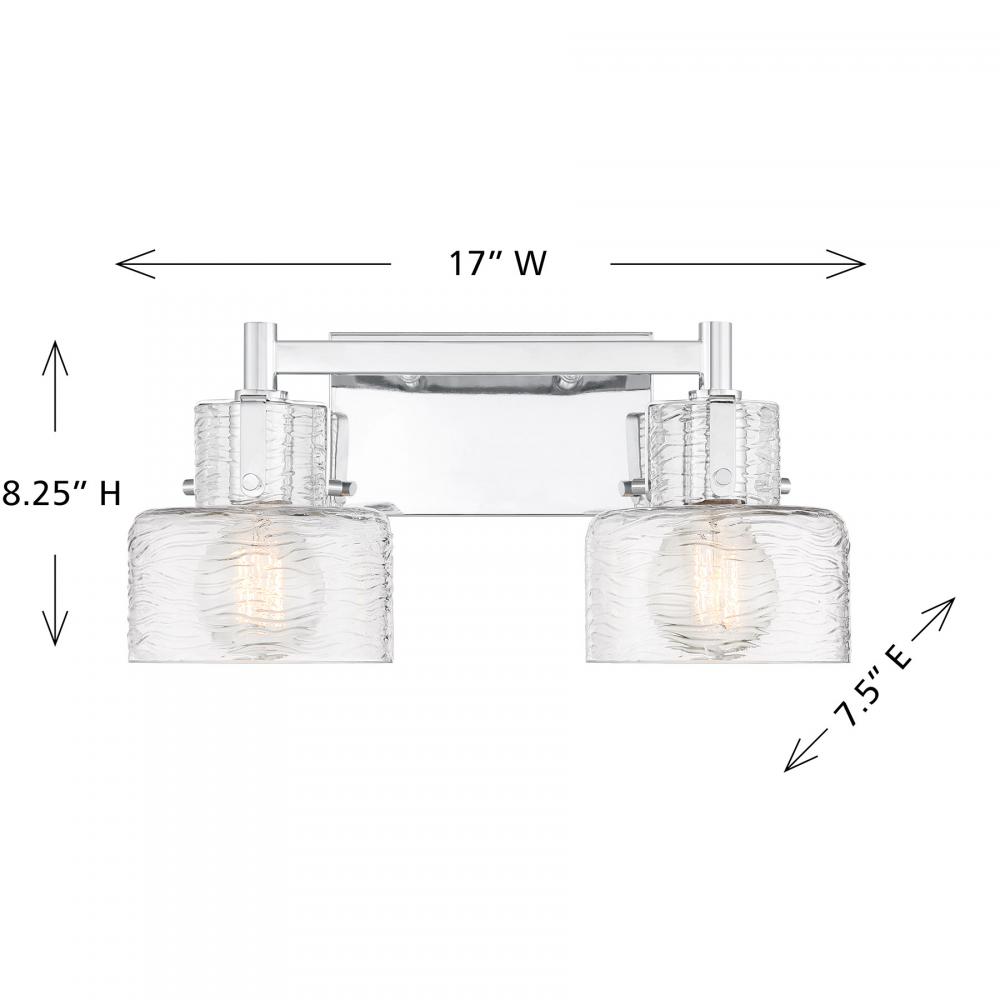 The Savoy House Dover 2-light bath light showcases standout bathroom lighting style! Clear glass shades feature a beautifully textured pattern that recalls ocean waves. These glass shades are held to the base by arms that are finished in Chrome and decorated with visible hardware to add a hint of vintage inspiration. Dover is 8.25" in height, 17" in width and extends 7.5" from the wall. It uses two standard size bulbs of up to 60 watts per bulb. Bulbs not included. Install as pictured. This bath bar is damp area rated.