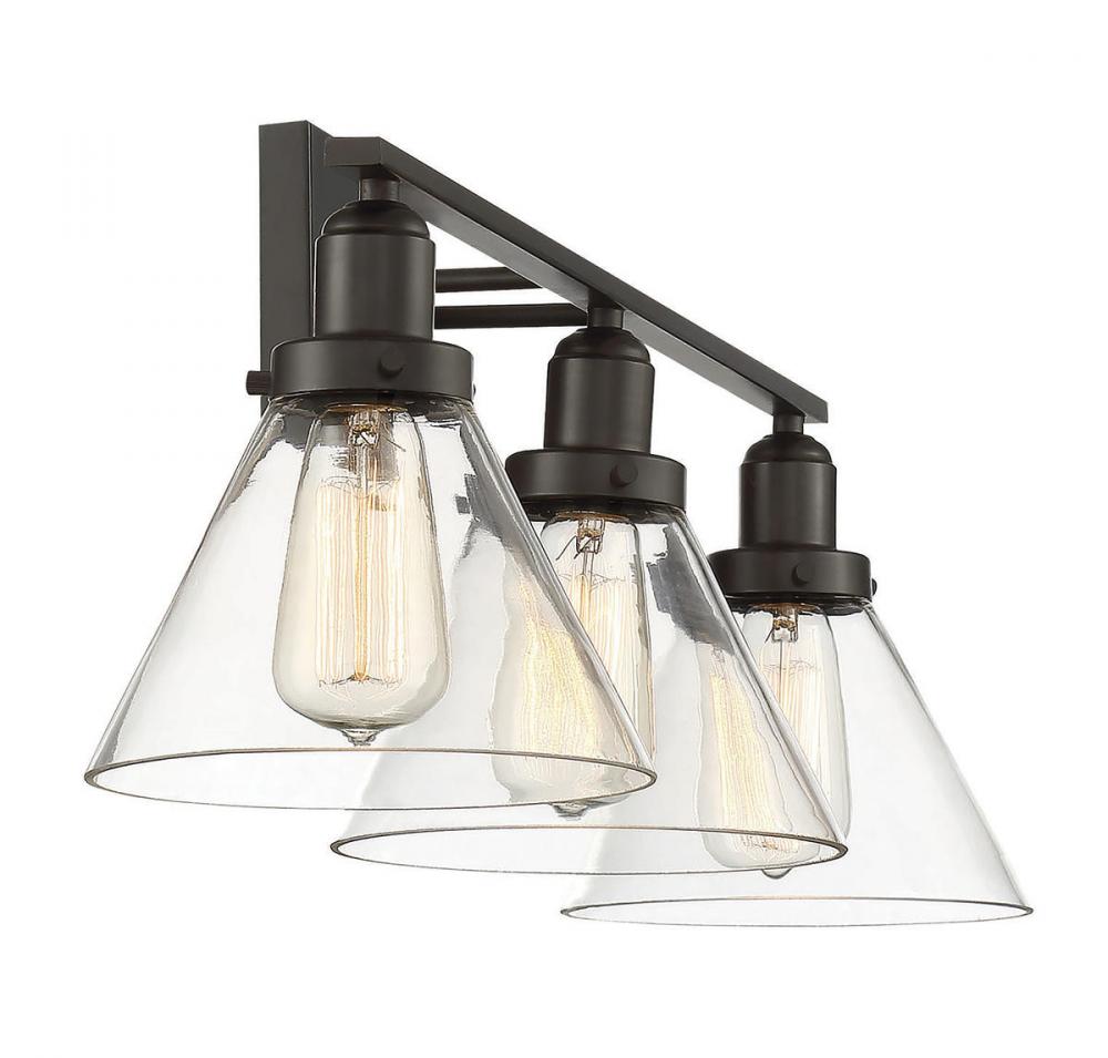 This Savoy House Drake 3-light bath bar has an alluringly simple style with a few choice hardware details and shades of clear glass. It may be mounted as either uplight or downlight. Bath bar lights are a classic choice for illuminating vanity mirrors in bathrooms big and small. Because the bulbs are exposed, try using stylized bulbs (not included) such as Edison for a different look! The English bronze finish can be paired with bronze hardware or mixed with hardware in other fixtures. Add Drake to industrial, transitional or contemporary rooms for a bold look. When you choose a Savoy House lighting fixture, you can be certain you’ve selected a piece that will withstand the test of time.