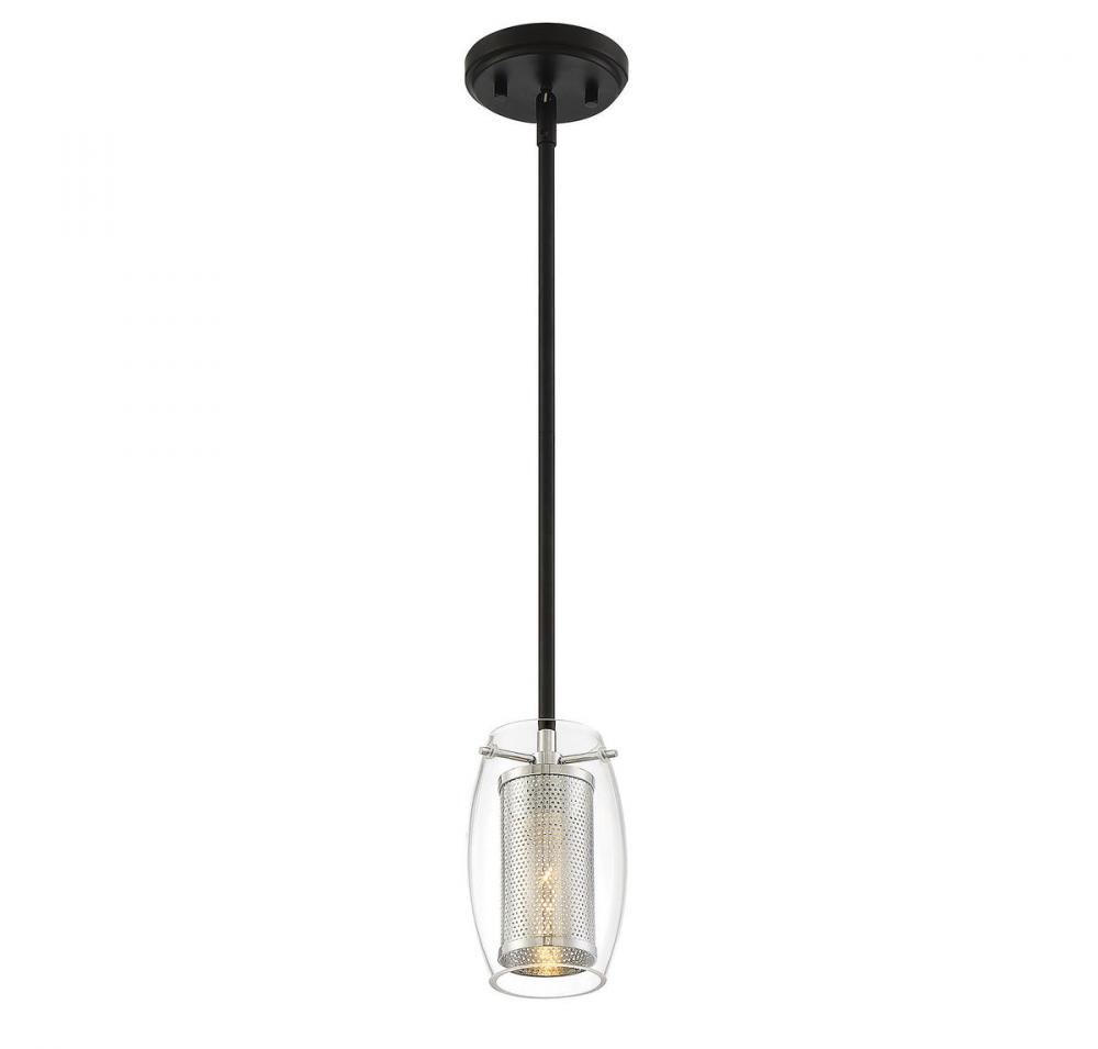 From the imaginative mind of designer Brian Thomas comes a mini light pendant with very big impact. Ultra chic and current with its use of mixed metals, the fashionable Dunbar 1-light mini-pendant by Savoy House is the ideal interior lighting choice for transitional, contemporary, mid-century modern, and industrial décors. With its polished chrome mesh and clear glass styling suspended by a sleek, two-tone matte black metal rod, it looks great as bath lighting, entry lighting, over a stairway or in the kitchen. Made with premium quality components, it has an adjustable rod length and canopy that adapts to sloped ceilings. Hang one for a minimalist look, or hang a grouping of these mini light pendants at varying heights for added impact.