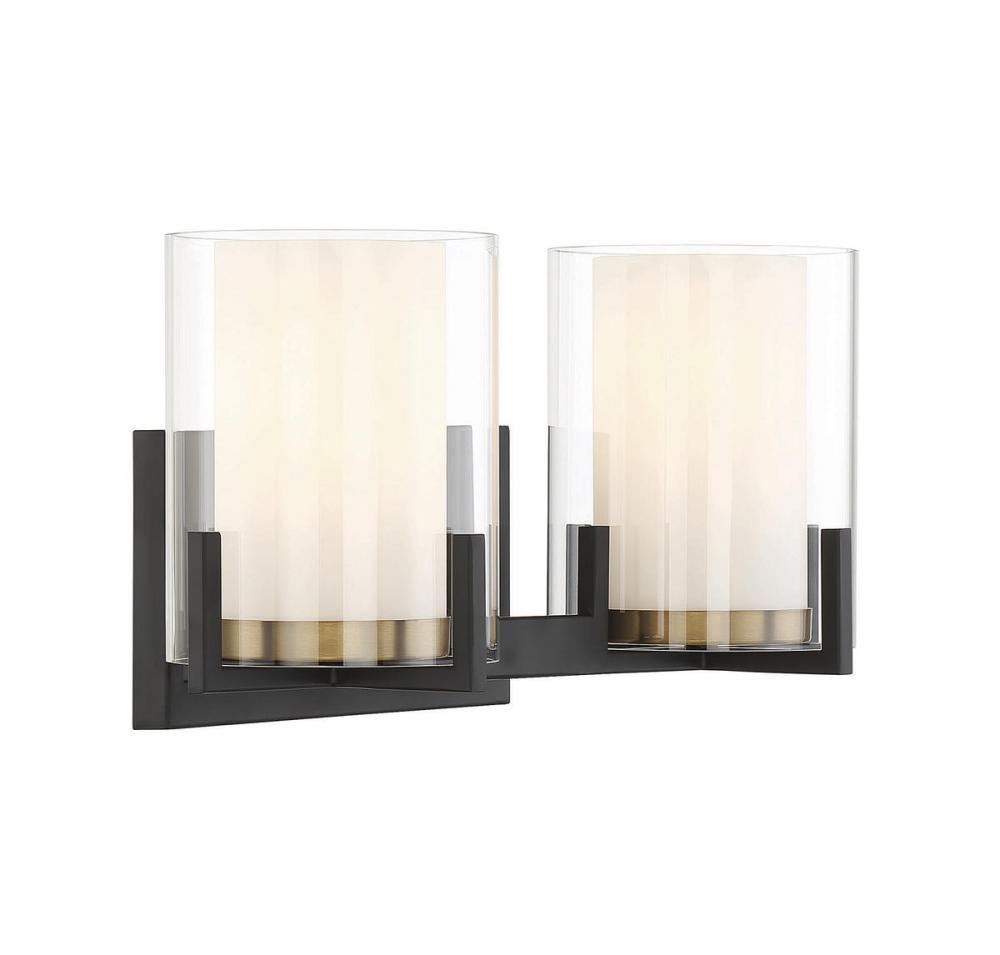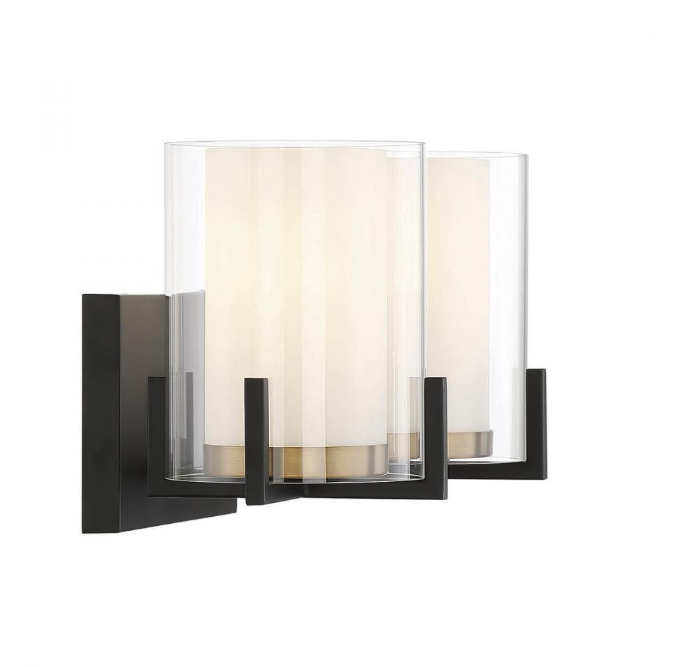 The Savoy House Eaton 2-light bath vanity light has an elegant and appealing look with shades of clear and white opal glass, jewelry-like prong detailing and a two-tone finish of black and brass. Create the illusion and beauty of candlelight with Eaton! This bath light is 7.5" in height, 15" in width and extends 7.5" from the wall. Uses two standard size bulbs of up to 60 watts per bulb. Damp area rated.