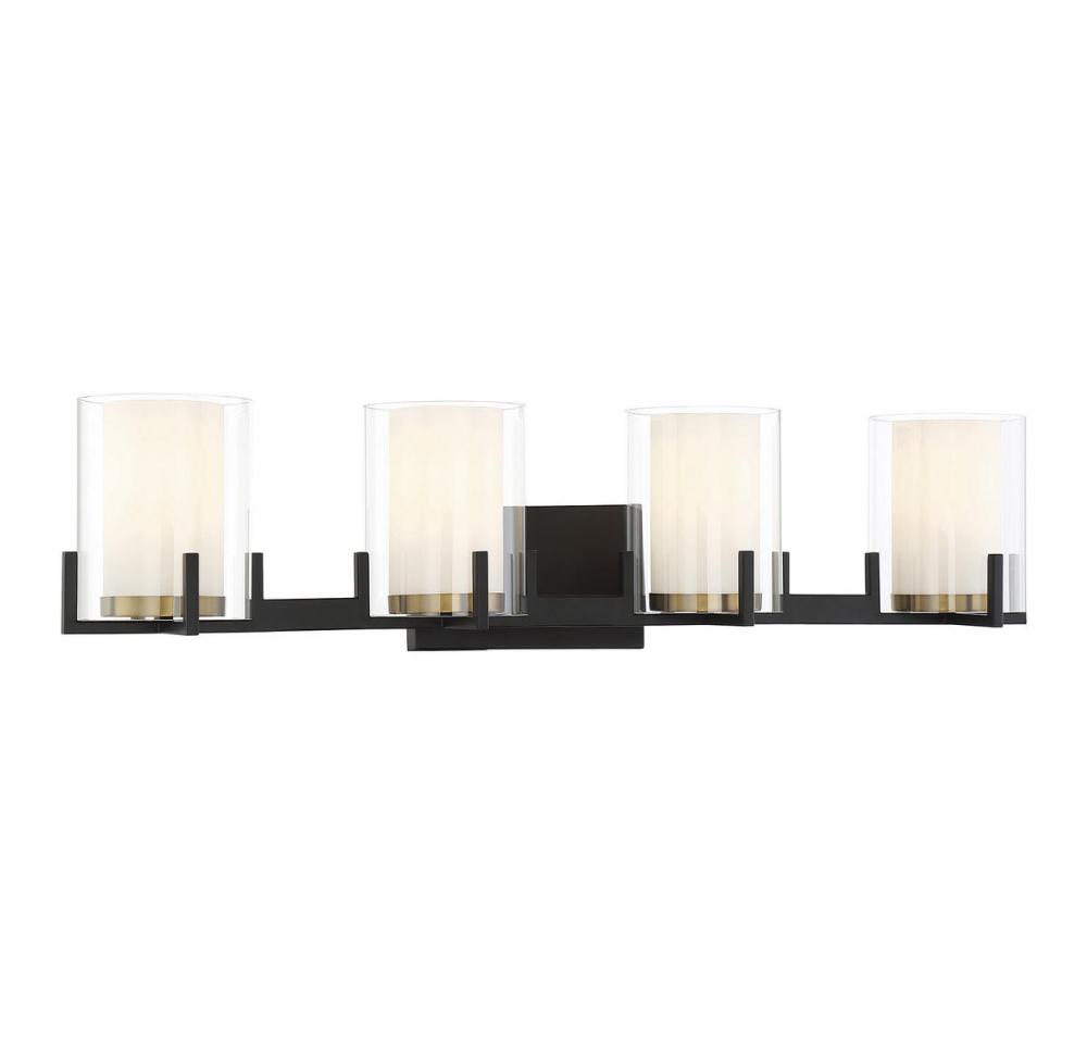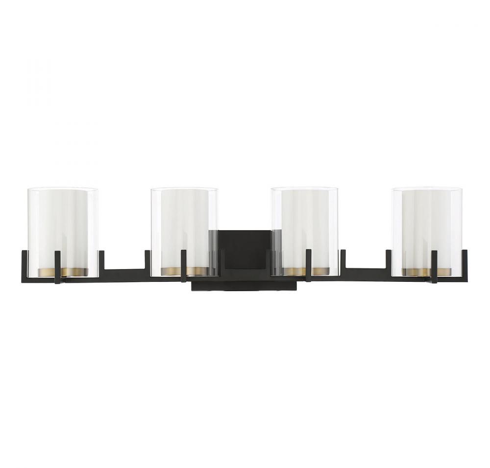 The Savoy House Eaton 4-light bath vanity light has an elegant and appealing look with shades of clear and white opal glass, jewelry-like prong detailing and a two-tone finish of black and brass. Create the illusion and beauty of candlelight with Eaton! This bath light is 7.5" in height, 33" in width and extends 7.5" from the wall. Uses four standard size bulbs of up to 60 watts per bulb. Damp area rated.