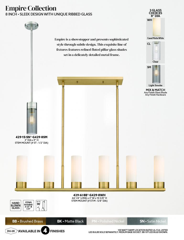 Empire is a showstopper and presents sophisticated style through subtle design. This exquisite line of fixtures features refined fluted pillar glass shades set in a delicately detailed metal frame.
