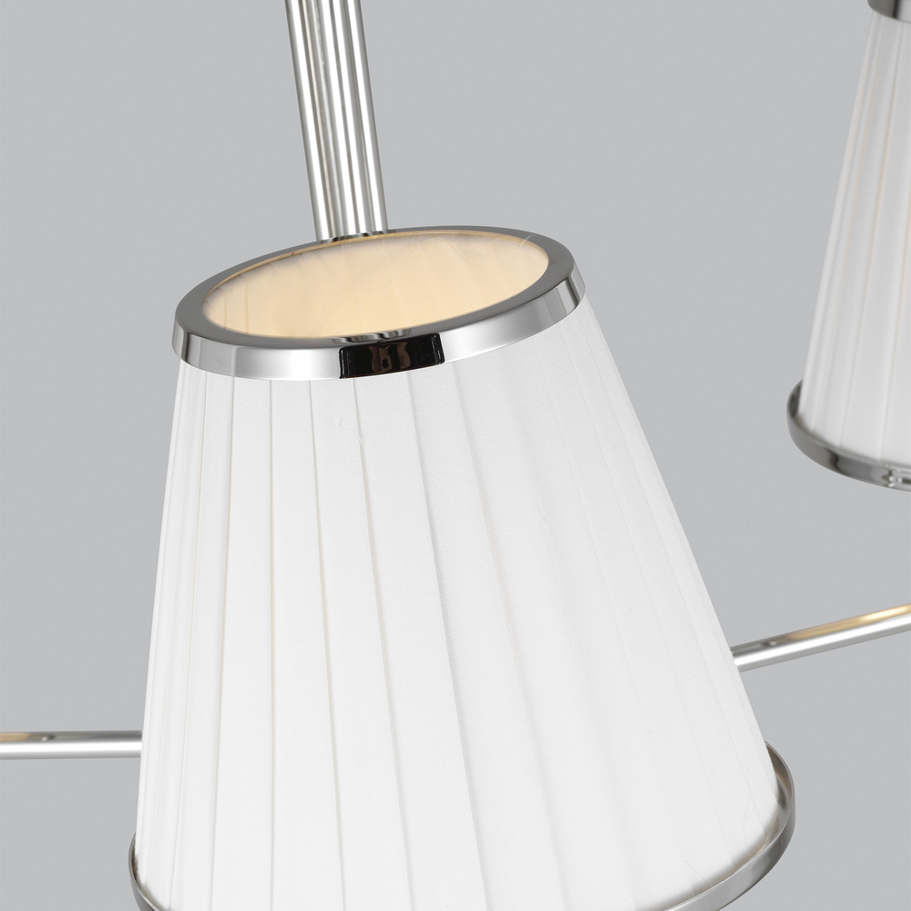 Esther small chandelier by Lauren Ralph Lauren is a transitional interpretation of a classic design. Esther has pleated shades that bring the visual interest to the collection, while a decorative yolk holds the shade to frame. Three different sconce silhouettes are included in the Ester series. Great attention to detail and crisp pleated shade this chandelier adds a refined equestrian feel to a dining space or entryway. Available in a Time Worn Brass or Polished Nickel finish.