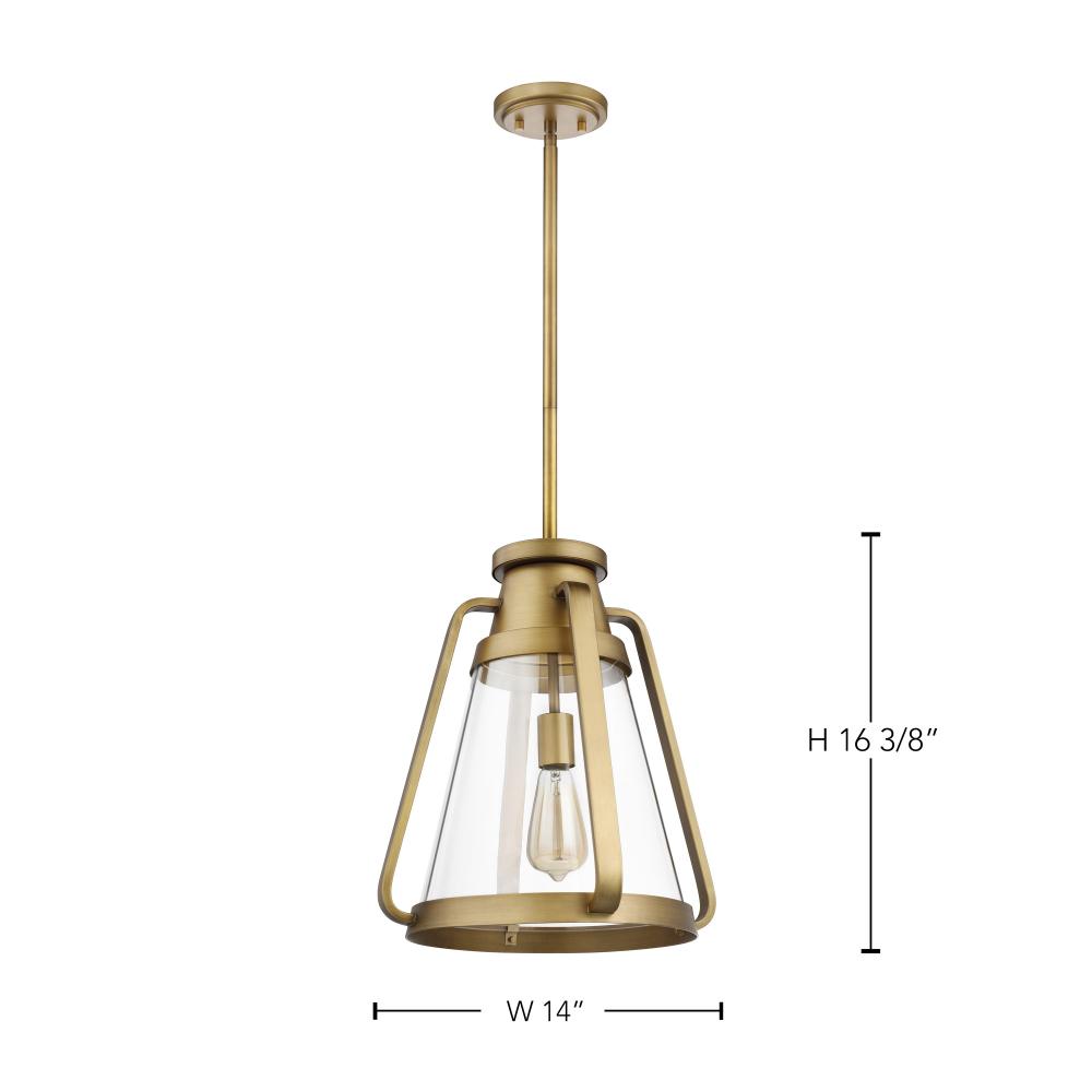 Glass and overlaying metal create a nice depth with the Everett 60-7563 medium pendant. The clear, tapered glass provides 360-degree illuminations. When paired with a vintage bulb, a touch of nostalgia complements the transitional design. A natural brass f