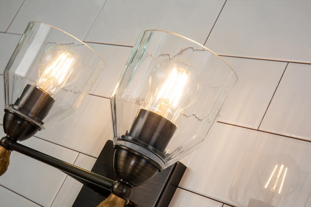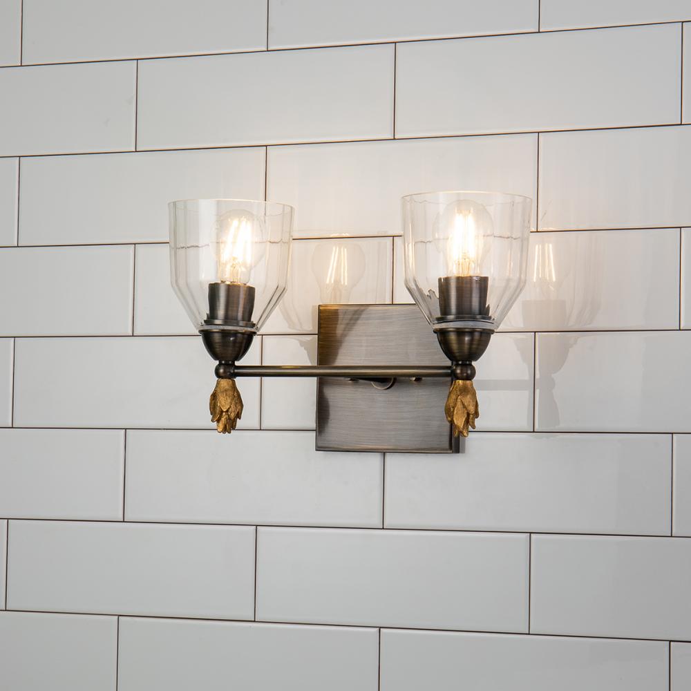 The Felice 2-Light Vanity Sconce blends classic and modern design with a dark bronze finish, gold finial, and dome-shaped glass shade. Perfect for bathrooms or artwork, its timeless style adds elegance to any space. Damp-rated and easy to install.