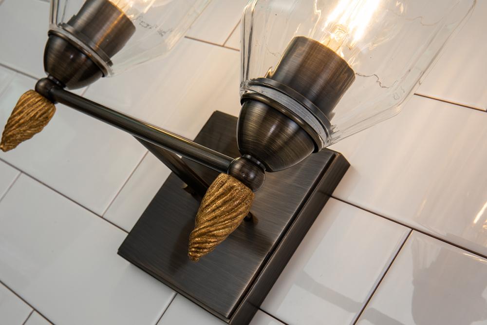 The Felice 2-Light Vanity Sconce blends classic and modern design with a dark bronze finish, gold finial, and dome-shaped glass shade. Perfect for bathrooms or artwork, its timeless style adds elegance to any space. Damp-rated and easy to install.