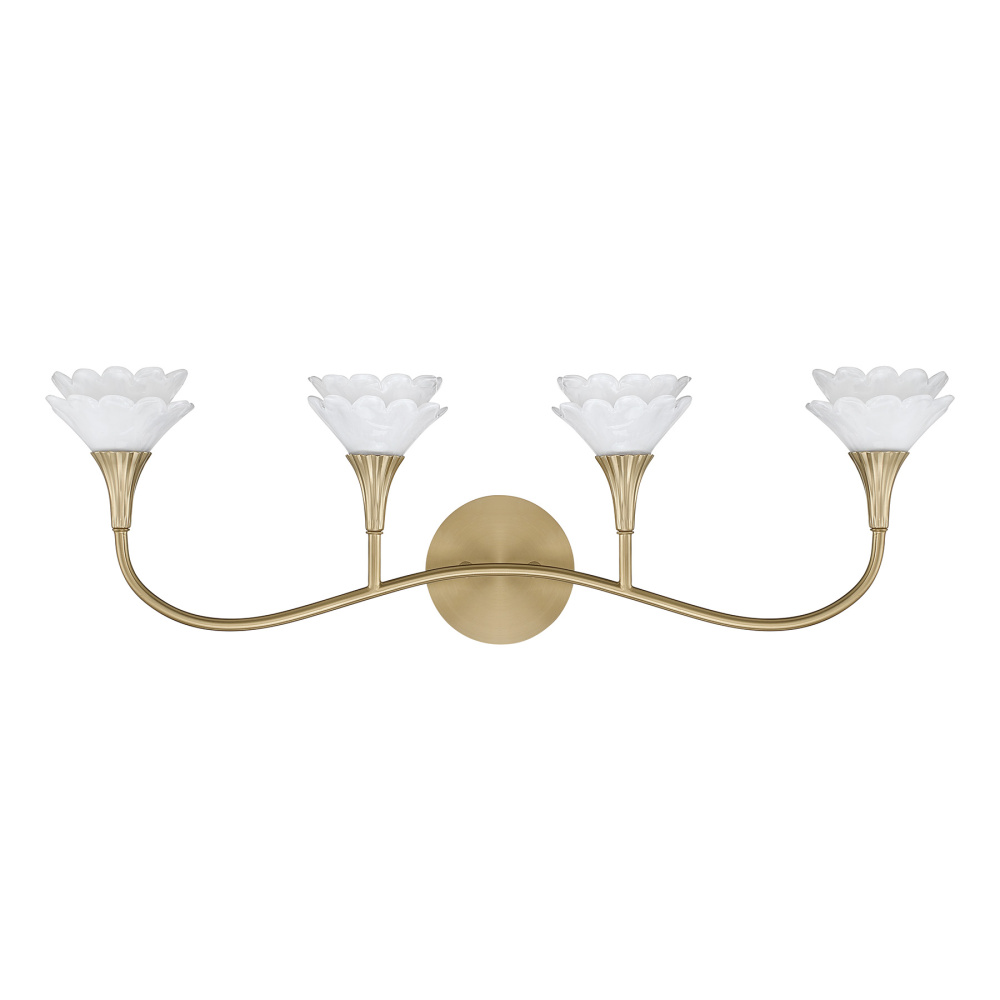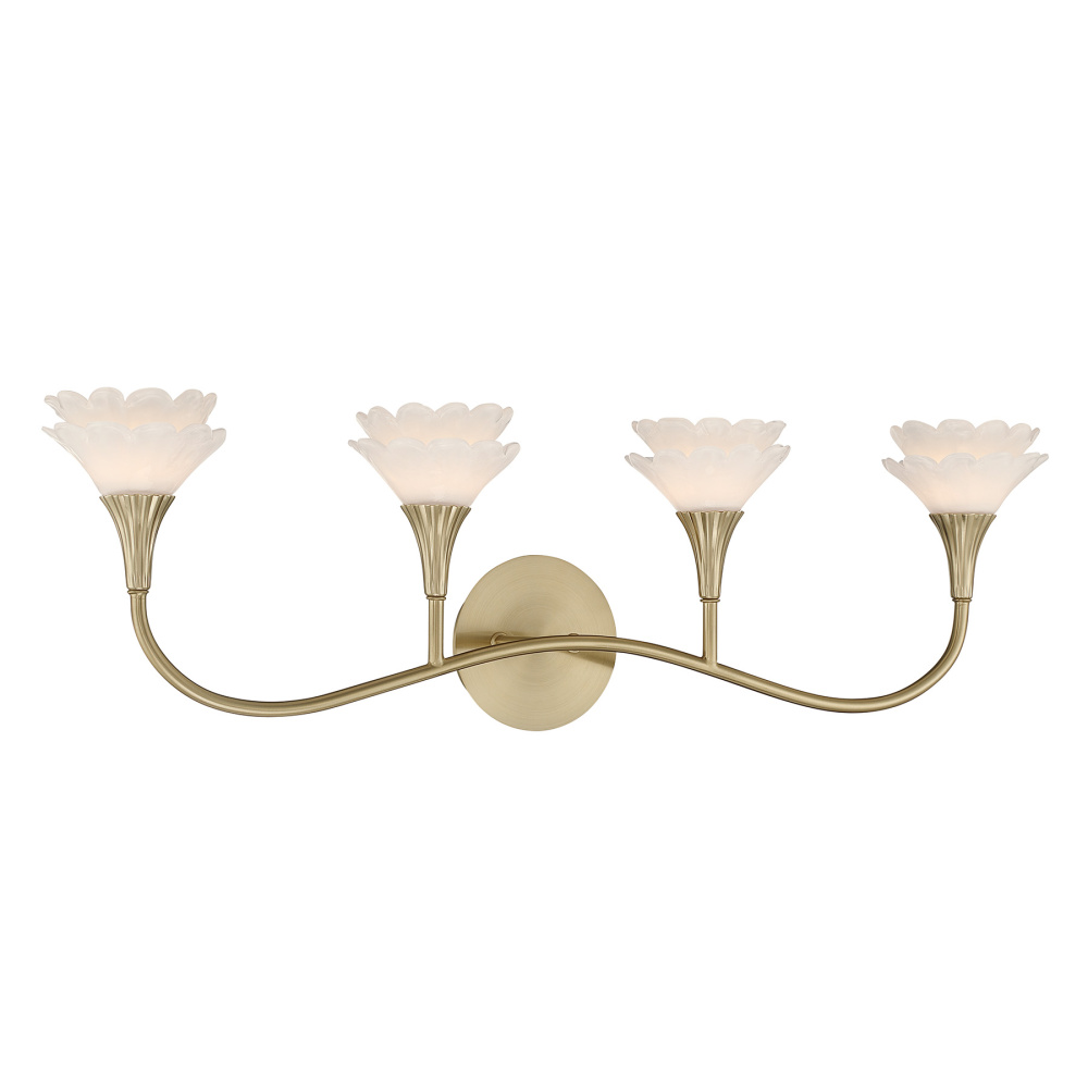 The Savoy House Florena 4-light bath vanity light showcases four pairs of sculptural flowers, each handcrafted from pearlescent white glass. Their layered, luminous petals pair with the Noble Brass finish to create an atmosphere of graceful elegance and soft radiance. Florena is 9" in height, 30.5" in width and extends 6" from the wall. It uses four G9 bulbs of up to 6 watts per bulb. Bulbs not included. Damp area rated. Designed by award-winning interior designer and TV host Breegan Jane.