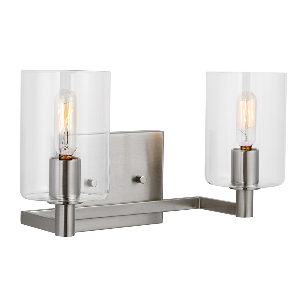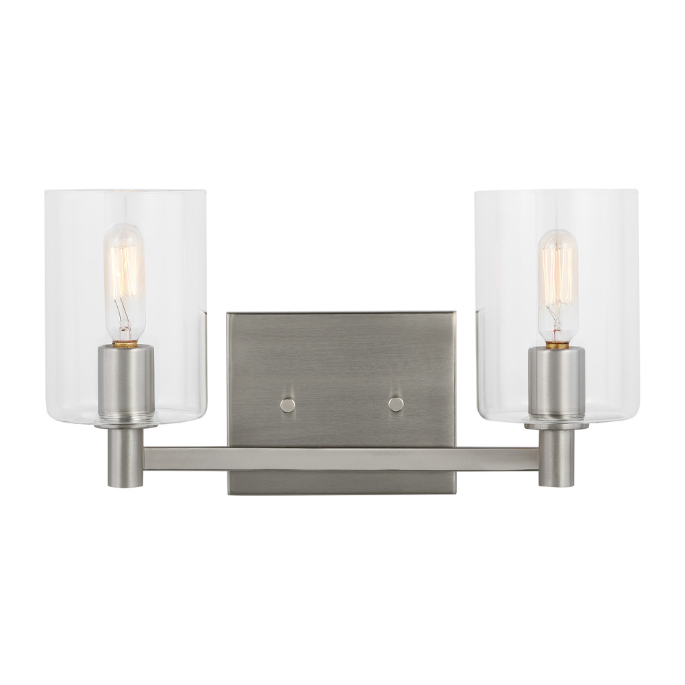 The Fullton two light vanity fixture in brushed nickel silver is sleek, contemporary, and uber minimalistic. Visual interest is created using a mix of rectangular and round frames, a subtle design detail. Although this collection is contemporary, it can be mixed in with variety of collections with ease.