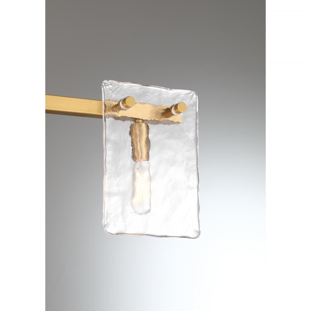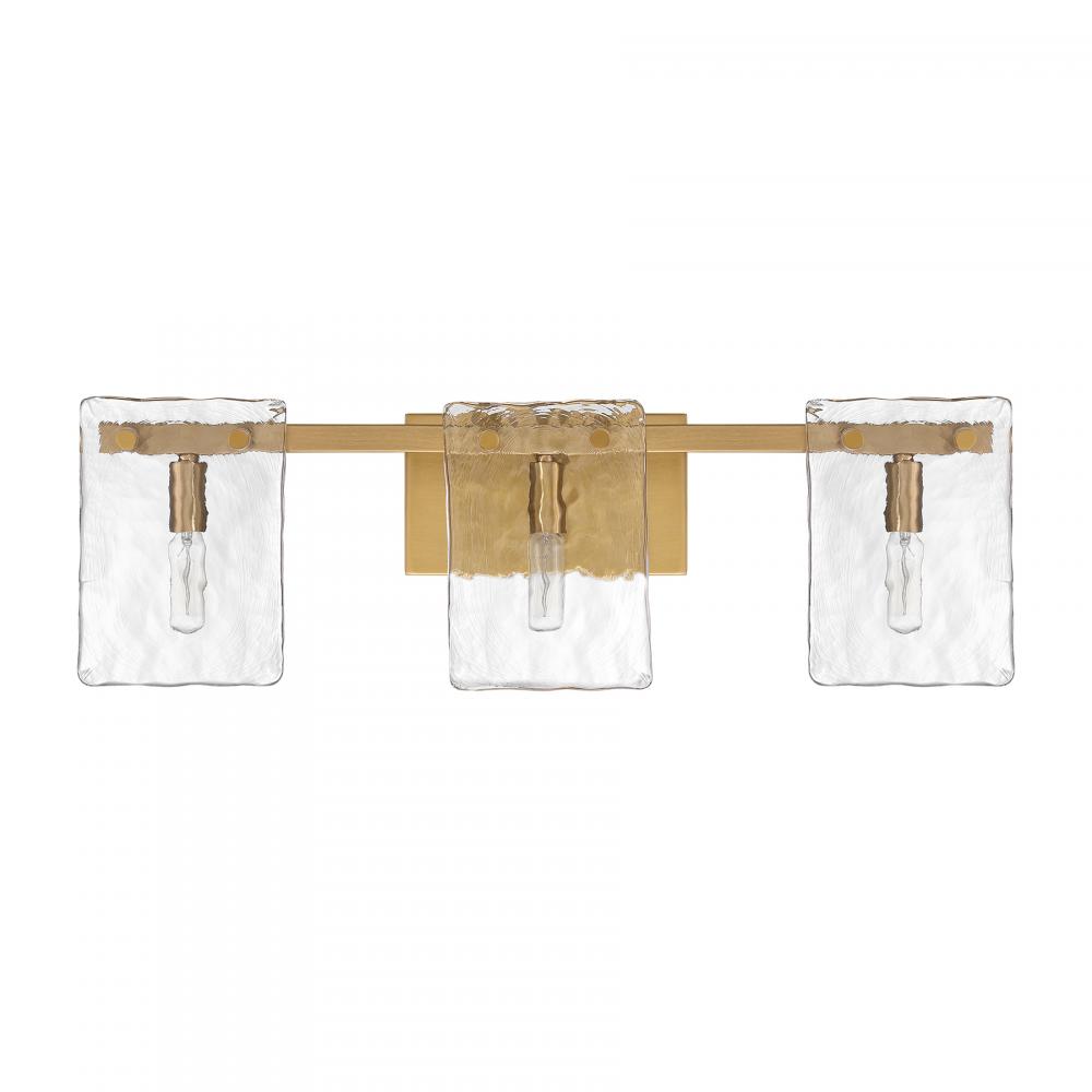 Bring a beautiful ocean-inspired lighting look to your home with the Savoy House Genry 3-light bath bar. It is decorated with rippling panes of handmade glass and finished in Warm Brass. Genry is 7.75" in height, 25" in width and extends 5.5" from the wall. It uses three candelabra size bulbs of up to 60 watts per bulb. Bulbs not included. This bath light is damp area rated and must be installed as shown.