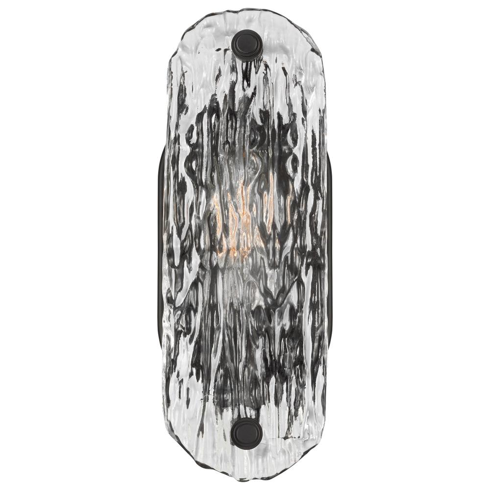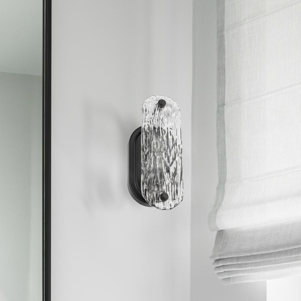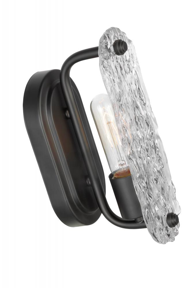 The Glacier 60-7811 one light vanity is styled with contemporary elements and rich finishes. A deep black adorns the fixture body and socket cover. An arresting ice glass completes the sleek silhouette. Pairing this wonderful fixture with a vintage bulb ta