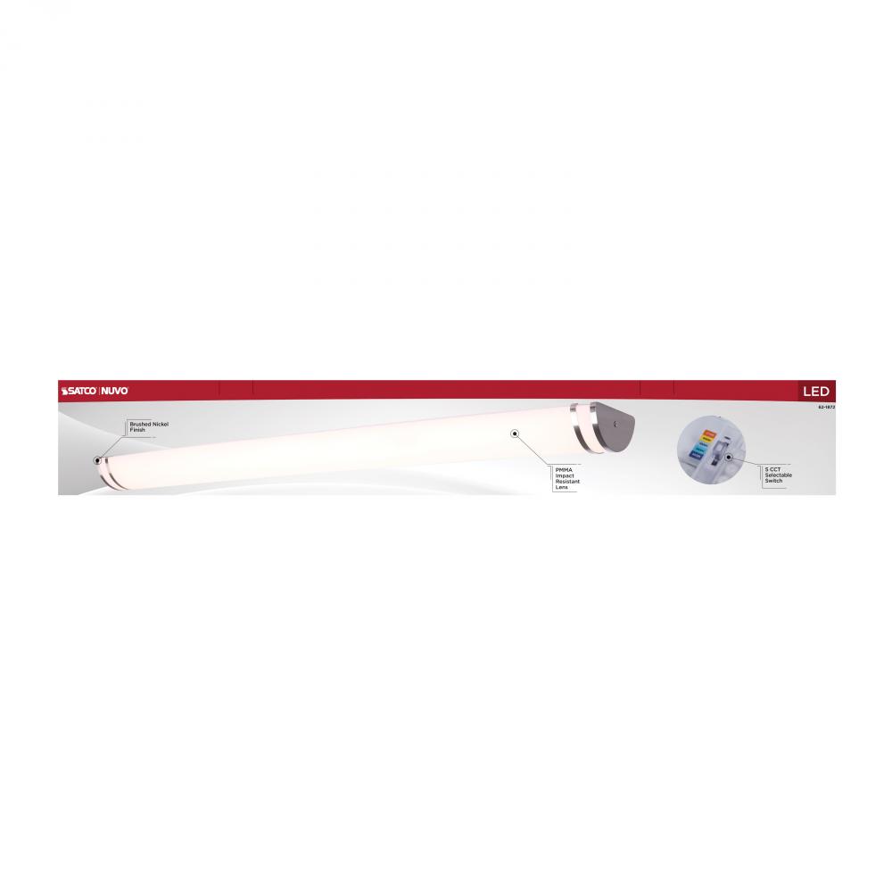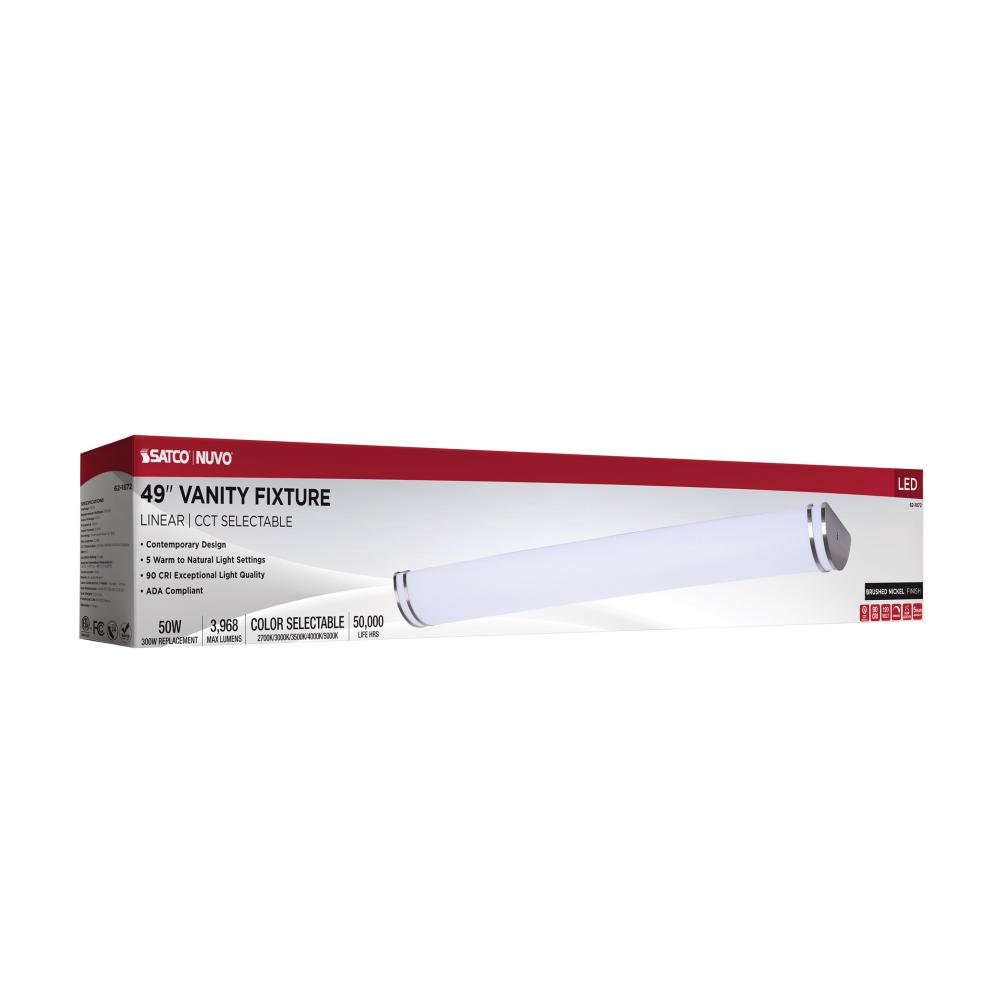 The SATCO NUVO 62-1872 Glamour 49-inch Vanity Fixture in Brushed Nickel combines sleek design with 5 CCT selectable technology (2700K–5000K) and 90 CRI illumination for superior color rendering. This 50-watt fixture replaces 300W incandescent lighting, o