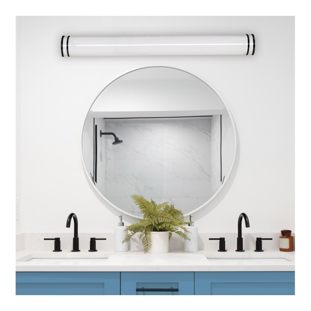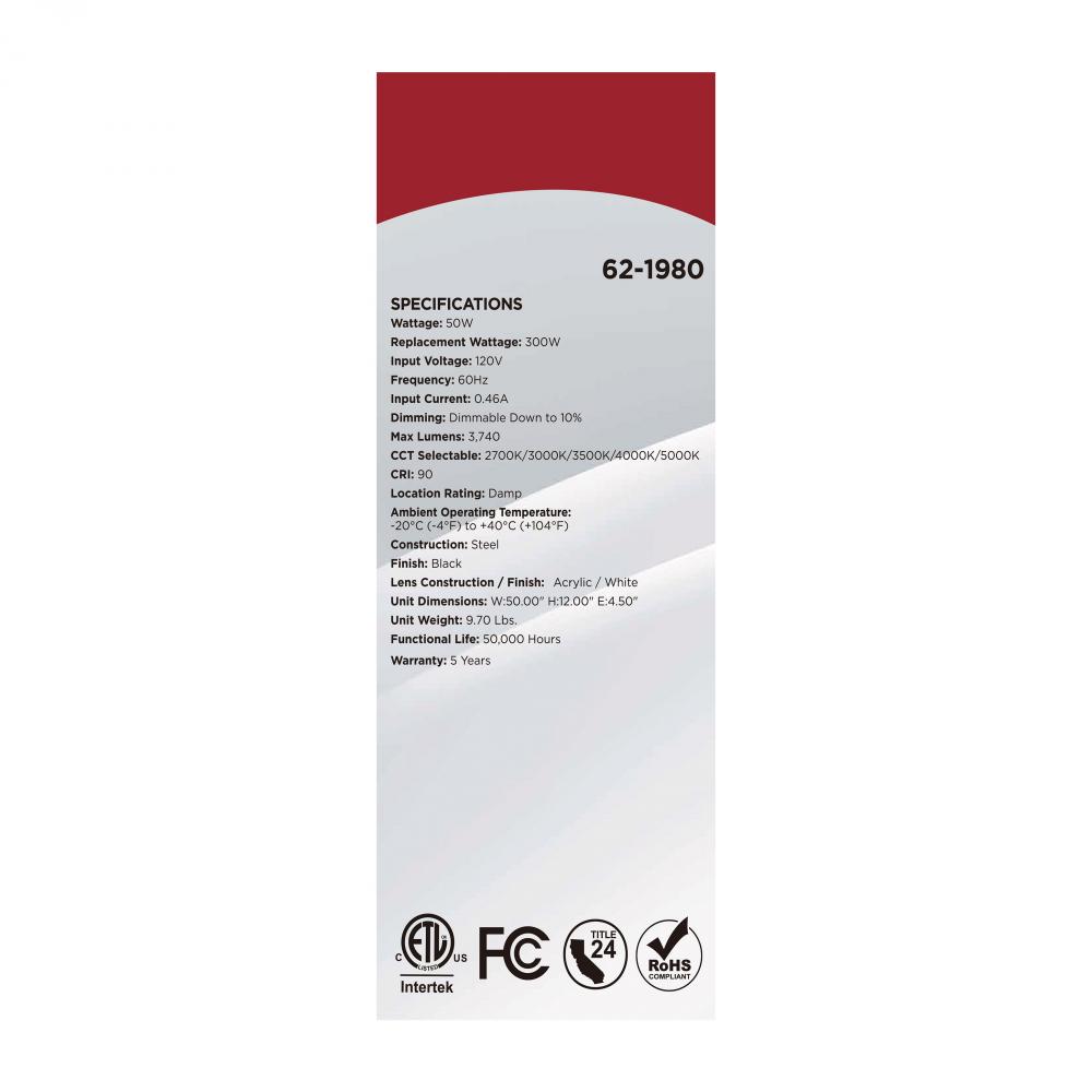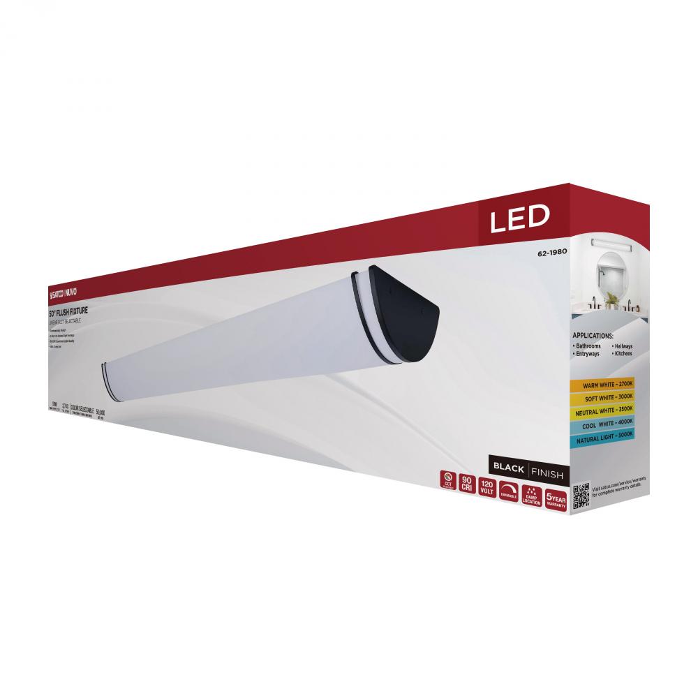 The SATCO NUVO 62-1980 Glamour 50-inch Linear Fixture in white with a black finish combines modern design with 5 CCT selectable technology (2700K–5000K) and 90 CRI illumination for enhanced color rendering. This 50-watt fixture replaces 300W incandescent