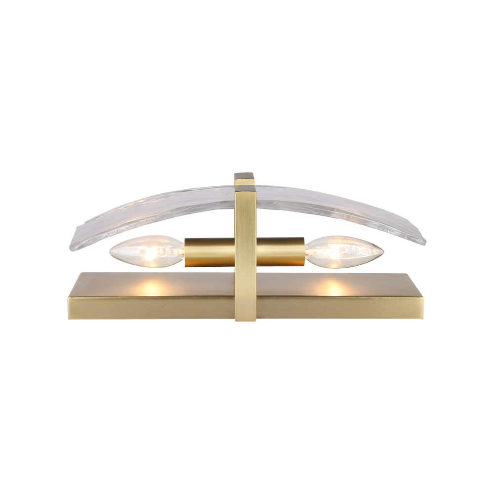Bring Nature-Inspired elegance into your home with the Golden Lighting Aenon 2-light Wall Sconce. Featuring a glass shade and a Brushed Champagne Brass frame, it creates a welcoming atmosphere. The glass shade showcases a stunning Hammered Water Glass, a transparent, colorless material characterized by a heavy, irregular texture that beautifully distorts light, reminiscent of ice and water. The Brushed Champagne Brass finish offers a sophisticated touch, achieved through a durable electroplating process that blends the warmth of brass with the softness of silver, ensuring a chic and versatile color. Ideal for enhancing hallways, stairways, or adding cozy ambiance in bedrooms and dining rooms, this fixture is Damp Location Rated, making it suitable for covered and semi-enclosed spaces such as bathrooms and covered porches. With overall dimensions of 6.25"W x 13"H x 4.75"D, it requires 2 E12 Candelabra base bulbs (not included) with a maximum wattage of 60 per bulb. Experience the quality craftsmanship of this wall sconce, designed to elevate your space with its unique organic details and artisanal appeal.