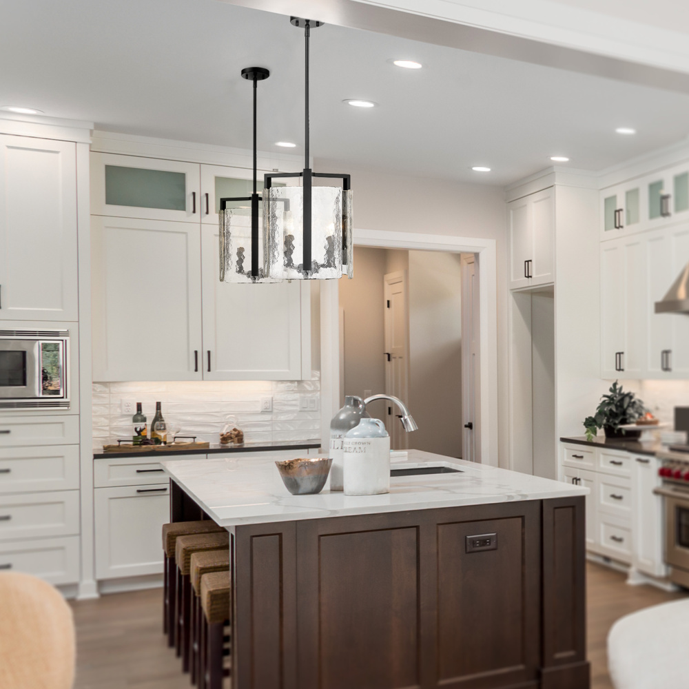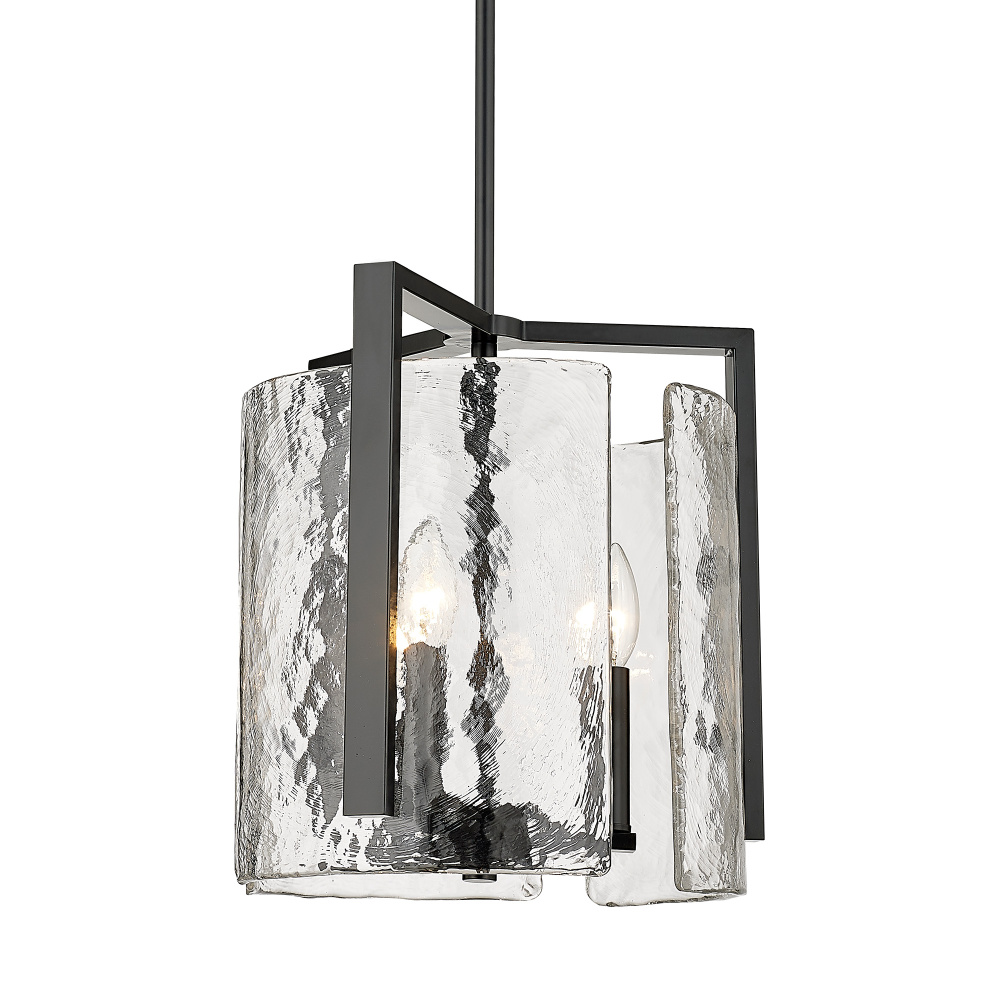 Bring nature-inspired elegance into your home with the Golden Lighting Aenon 3-light Pendant in Matte Black. Featuring a glass shade, it creates a welcoming atmosphere. This glass shade captures elemental beauty with its hammered water design that creates a beautifully distorted and refractive light effect. The matte black finish is the epitome of clean, modern style, offering timeless versatility that's smooth to the touch and complements various decor styles, from minimalist and industrial to bold contemporary. Ideal for kitchens, dining rooms, and bedrooms, this pendant is dry location rated for indoor spaces. Easily install it on angled ceilings and customize the hanging length for your space with its adjustable height feature (Min: 13.625"- Max: 58.25"). Overall dimensions are 13"W x 13.63"H x 13"D, and it requires three E12 candelabra base bulbs (not included), with a maximum wattage of 60 per bulb. The Aenon Pendant is not only a stylish statement piece but also designed with quality craftsmanship, enhancing your interior with its artistry and elegance.