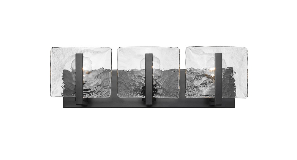 Bring nature-inspired elegance into your home with the Golden Lighting Aenon 3-light Vanity in Matte Black. Featuring a glass shade and a matte black frame, it creates a welcoming atmosphere. The hammered water glass shade showcases a heavy, irregular texture that mimics the beauty of ice and water, designed to create a beautifully distorted light effect. The matte black finish is timeless and versatile, complementing various décor styles while providing a sophisticated touch. This vanity light is perfect for brightening bathrooms with practical task illumination. Damp Location Rated: Suitable for covered and semi-enclosed spaces with occasional moisture, like bathrooms and laundry rooms. Overall Dimensions: 21.75"W x 6.75"H x 5.88"D. Requires 3 E26 Medium base bulbs (not included), with a maximum wattage of 100 per bulb. Experience quality and modern elegance with this stunning fixture that enhances any bathroom's design.
