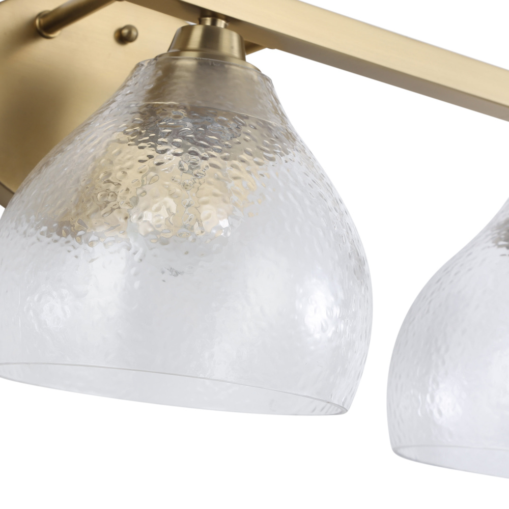 Bring Transitional elegance into your home with the Golden Lighting Ariella 3-light Vanity in Brushed Champagne Brass. Featuring a glass shade, it creates a welcoming atmosphere. The Hammered Clear Glass shade showcases a captivating texture that reflects light brilliantly. The sophisticated Brushed Champagne Brass finish provides a chic alternative to gold, ensuring a soft and warm ambiance. Rated for damp locations, the fixture is perfect for bathrooms or other moisture-prone areas. It requires 3 E26 Medium base bulbs (not included, max 60 watts per bulb), and its overall dimensions are 26.38"W x 8.88"H x 8.88"D. Discover a blend of elegance and quality with Golden Lighting.