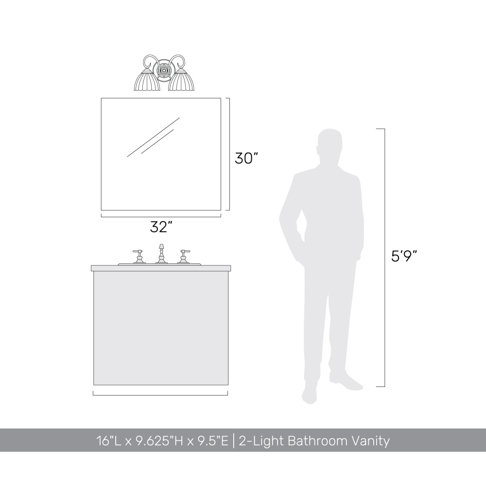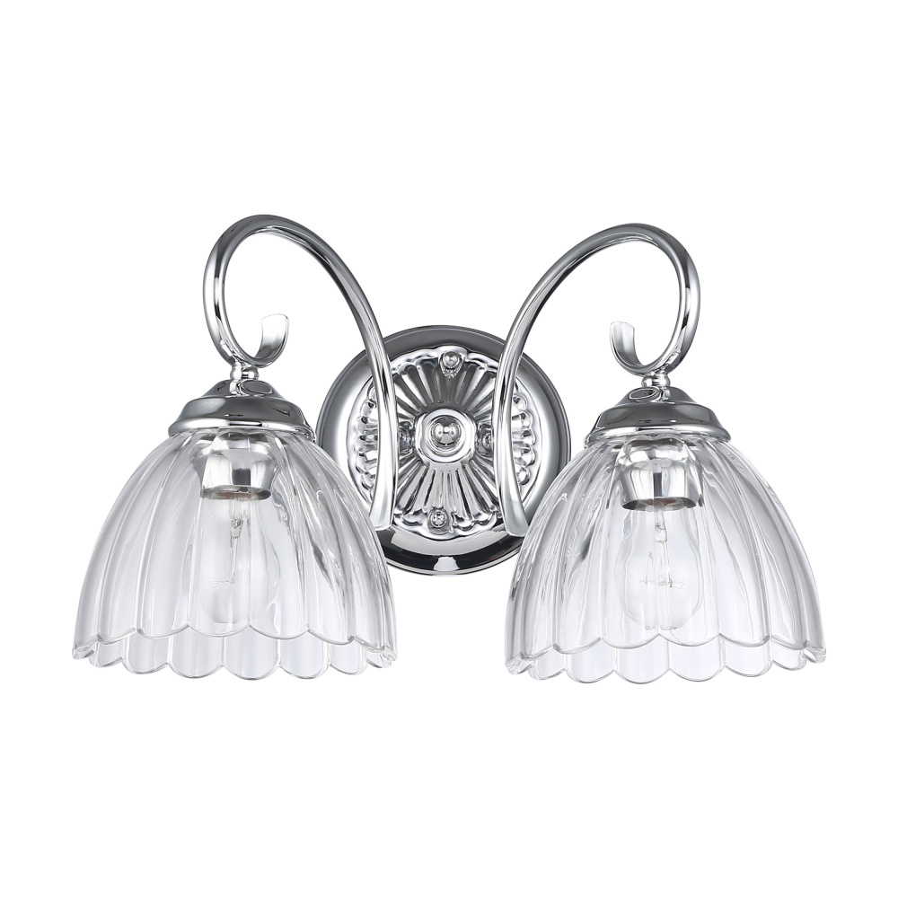 Bring glamorous elegance into your home with the Golden Lighting Audra 2-light Vanity. Featuring a glass shade and a polished Chrome frame, it creates a welcoming atmosphere. The clear glass shade offers brilliant, unobstructed light that illuminates your space beautifully. Brilliant and timeless, the Polished Chrome finish complements any décor style, offering a clean, sophisticated look. This vanity is damp location rated, suitable for bathrooms and covered spaces. Requires 2 E26 Medium base bulbs (not included), with a maximum wattage of 60 per bulb. Overall dimensions are 16"W x 9.63"H x 9.5"D. Elevate your bathroom with this sophisticated fixture that combines functionality and luxe appeal.