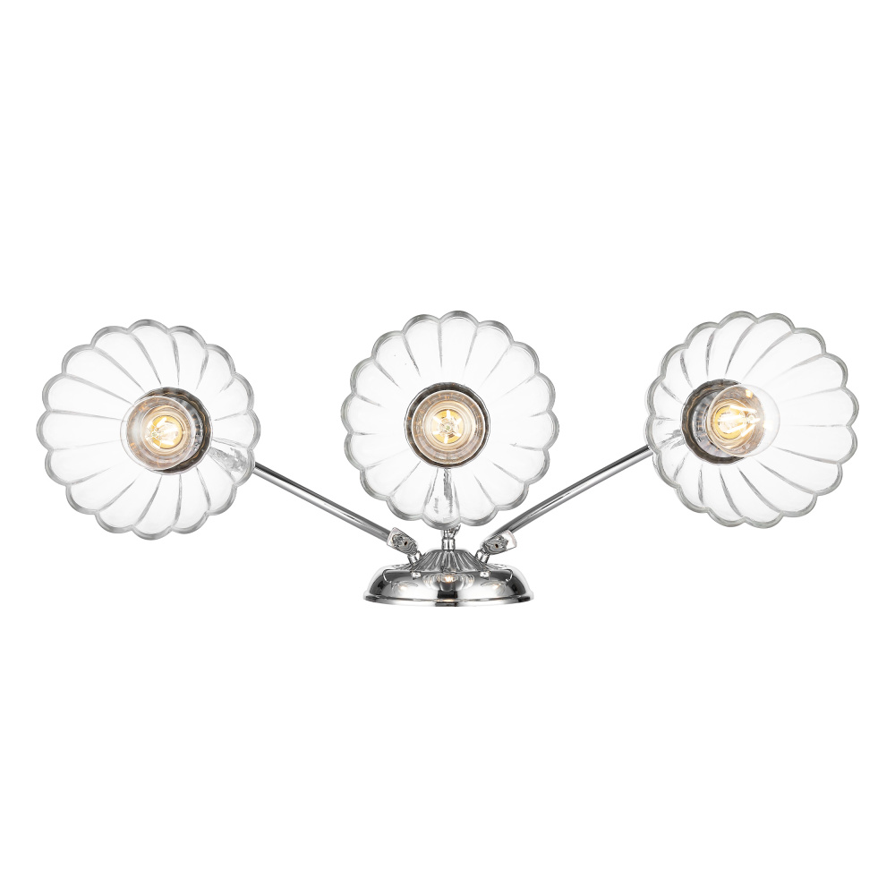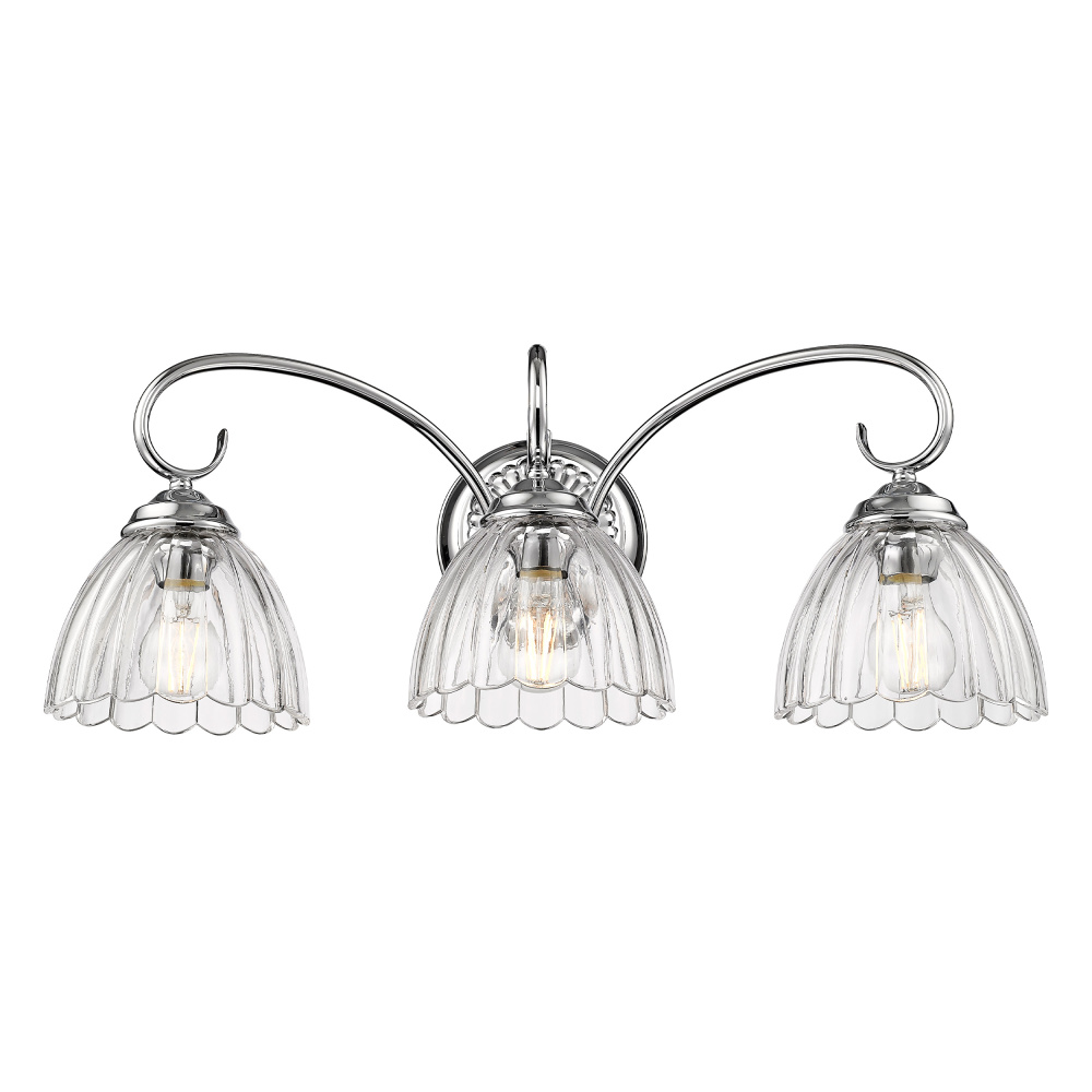 Bring glam elegance into your home with the Golden Lighting Audra 3-light Vanity. Featuring a glass shade and a polished Chrome frame, it creates a welcoming atmosphere. The clear glass shade showcases a brilliant, unobstructed light, perfectly complementing the fixture's design. Crafted with a brilliant and timeless Polished Chrome finish, its highly reflective surface adds a stunning shine and integrates seamlessly into various decor styles. Brighten up bathrooms with dedicated lighting that flatters while providing practical task illumination. Rated for damp locations, this fixture is suitable for covered and semi-enclosed spaces like bathrooms and laundry rooms. Requires 3 E26 Medium base bulbs (not included), with a maximum wattage of 60 per bulb. Overall dimensions are 25.5"W x 9.63"H x 9.5"D. Experience the perfect fusion of style and functionality, and upgrade your home's look with this luxurious vanity light.