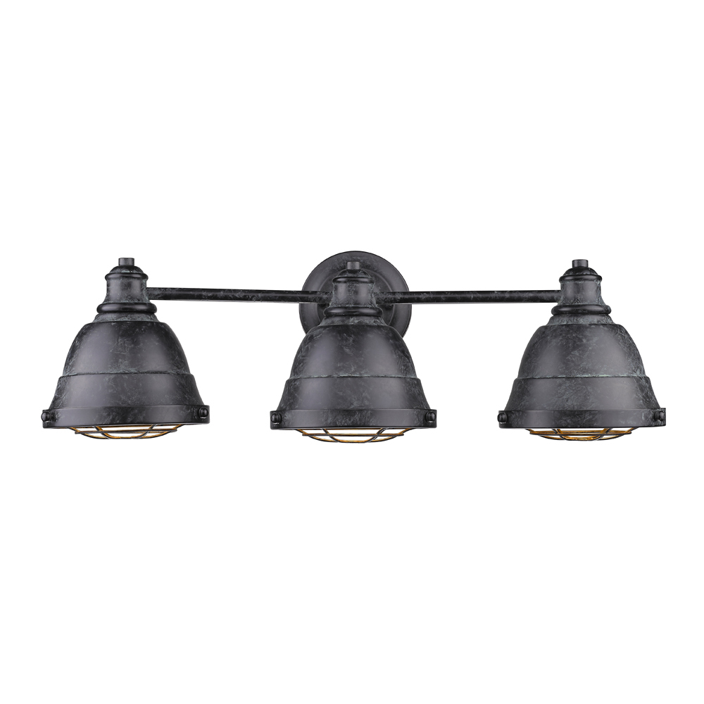 Bring industrial style into your home with the Golden Lighting Bartlett 3-light Vanity in Black Patina. Featuring a metal shade and a sophisticated Black Patina frame, it creates a welcoming atmosphere. This metal shade boasts a Black Patina finish that features a soft black base with a light gray chalky wash, establishing a subtly aged appearance that highlights the fixture's form beautifully. With its refined aesthetic, this finish adds depth and sophistication to both modern and traditional spaces, complementing various décor styles. Ideal for brightening bathrooms, this light is damp location rated for safe installation in covered and semi-enclosed spaces. The overall dimensions are 24.38"W x 8.13"H x 7.75"D, and it requires 3 E26 medium base bulbs (not included), with a maximum wattage of 100 per bulb. Enhance your bathroom's functionality and style with this exquisite vanity light that showcases quality craftsmanship and a timeless look.